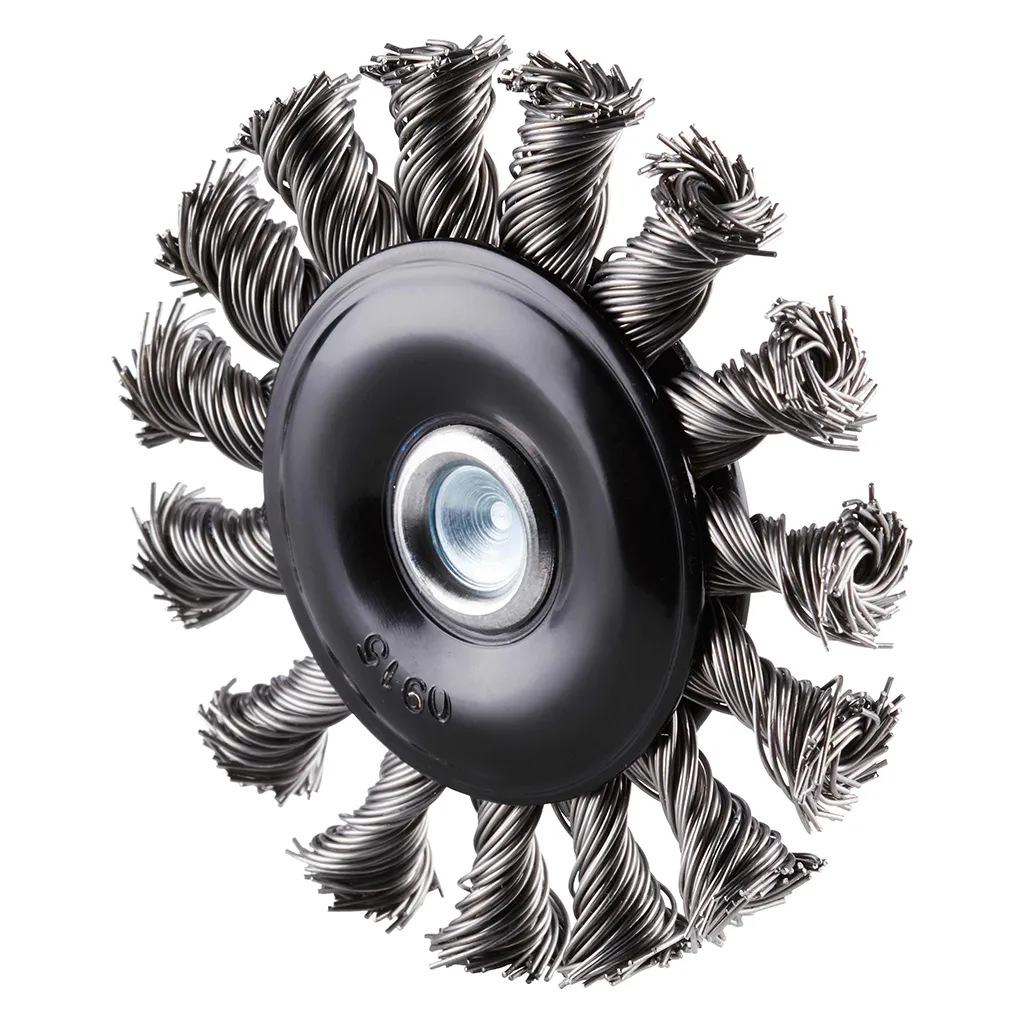 Brosse circulaire en acier avec fil d’acier torsadé sur tige 6 mm pour une utilisation sur meuleuses droites et arbres flexibles.