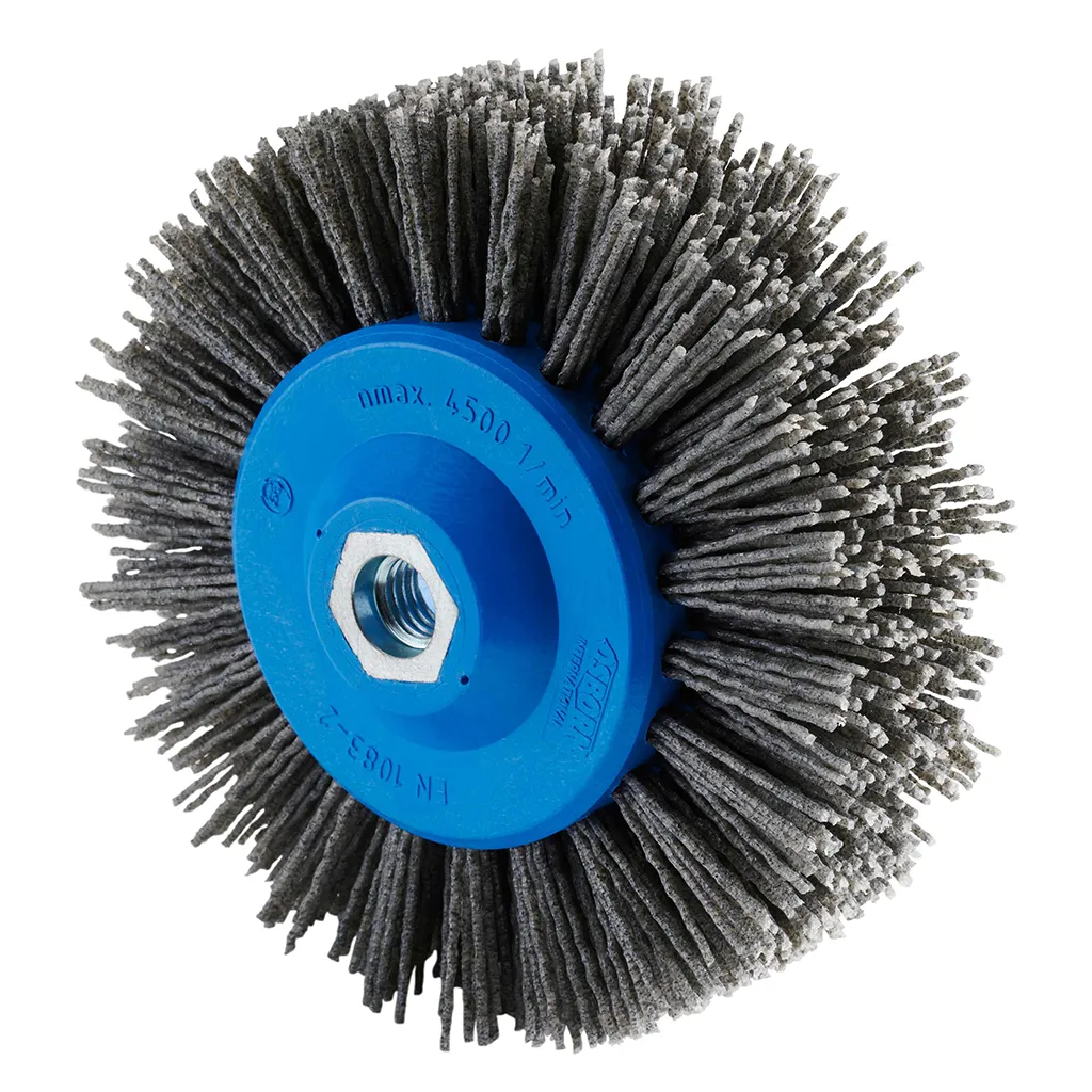 Le diamètre d’une brosse, la longueur de la garniture, ainsi que sa densité sont des facteurs décisifs pour obtenir les meilleurs résultats pour le traitement des surfaces. Plus les fils sont longs, plus la brosse sera souple et flexible. Ces brosses conviennent donc parfaitement pour le traitement des pièces structurées et un traitement délicat des surfaces. Plus les fils sont courts, plus le travail avec cette brosse sera agressif. Pour garantir un traitement le plus efficace possible de vos surfaces, veuillez choisir le plus grand diamètre de brosse possible pouvant être monté sur la machine utilisée. Un densité élevée de la garniture n’est pas seulement la base de performances optimales, mais bien aussi d’une durée de vie étendue de la brosse. Les garnitures moins denses augmentent la flexibilité des fils et permettent donc un meilleur traitement des surfaces profilées.
