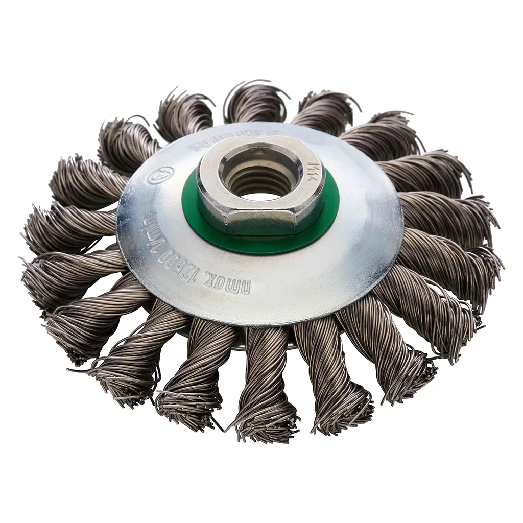 Brosse conique en acier inoxydable avec fil torsadé en acier inoxydable pour une utilisation sur meuleuses d’angle.
