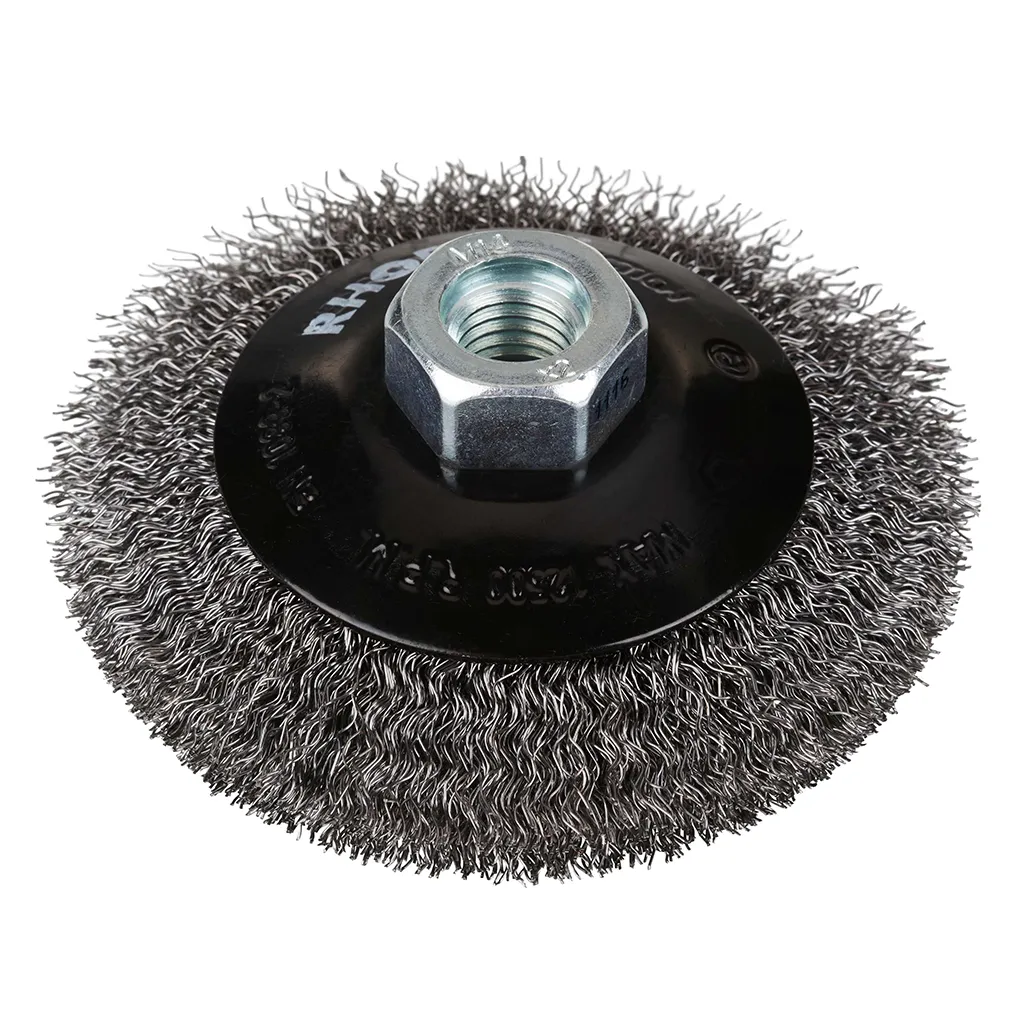 Brosse conique en acier avec fil ondulé en acier pour meuleuse d’angle.
