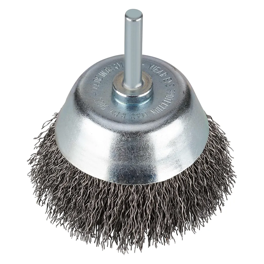 Brosse coupe en acier avec fil d’acier ondulé sur tige 6 mm pour une utilisation sur meuleuses droites. Avec vitesse de rotation maximale admise élevée.