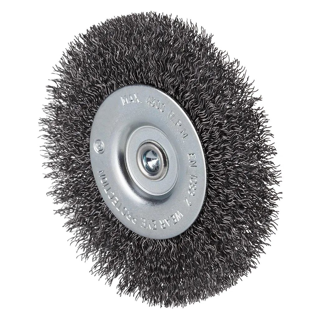 Brosse circulaire en acier avec fil d’acier ondulé sur tige 6 mm pour une utilisation sur perceuses.