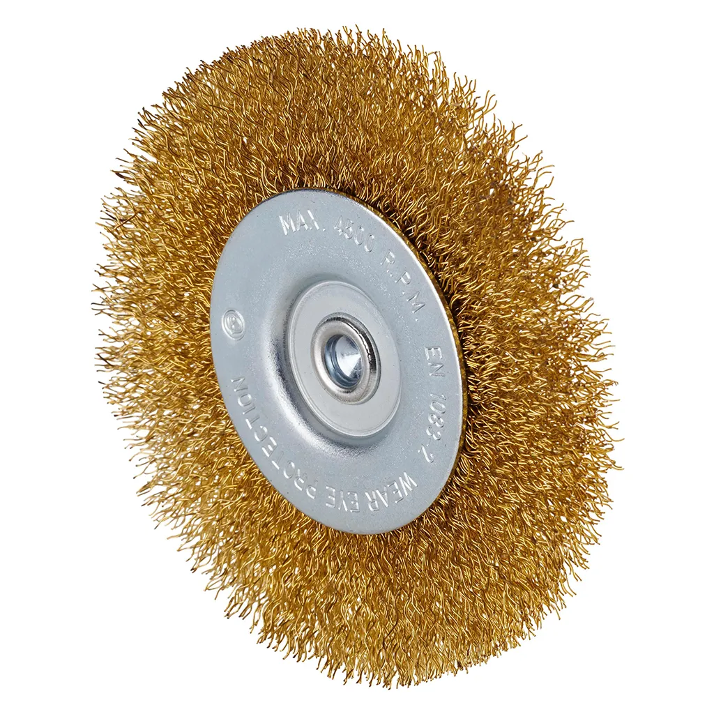 Brosse circulaire en acier avec fil d’acier ondulé sur tige 6 mm pour une utilisation sur perceuses.