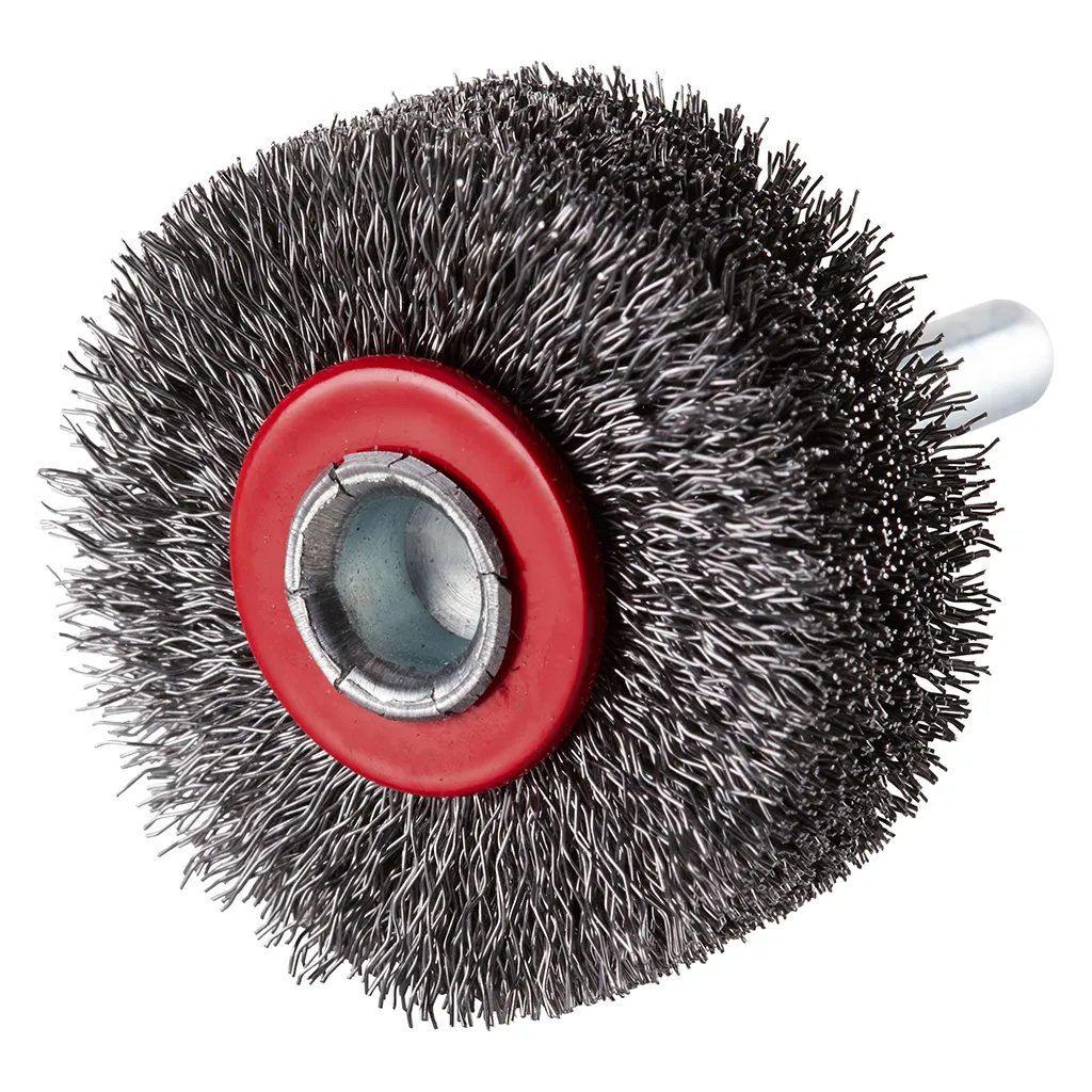 Brosse circulaire en acier avec fil d’acier ondulé sur tige 6 mm pour une utilisation sur meuleuses droites. Avec vitesse de rotation maximale admise élevée.