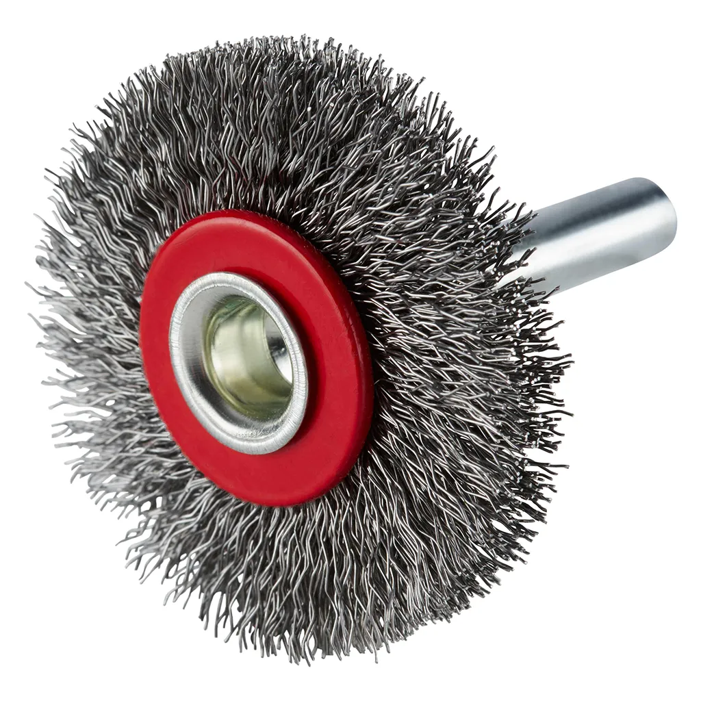 Brosse circulaire en acier avec fil d’acier ondulé sur tige 6 mm pour une utilisation sur meuleuses droites. Avec vitesse de rotation maximale admise élevée.