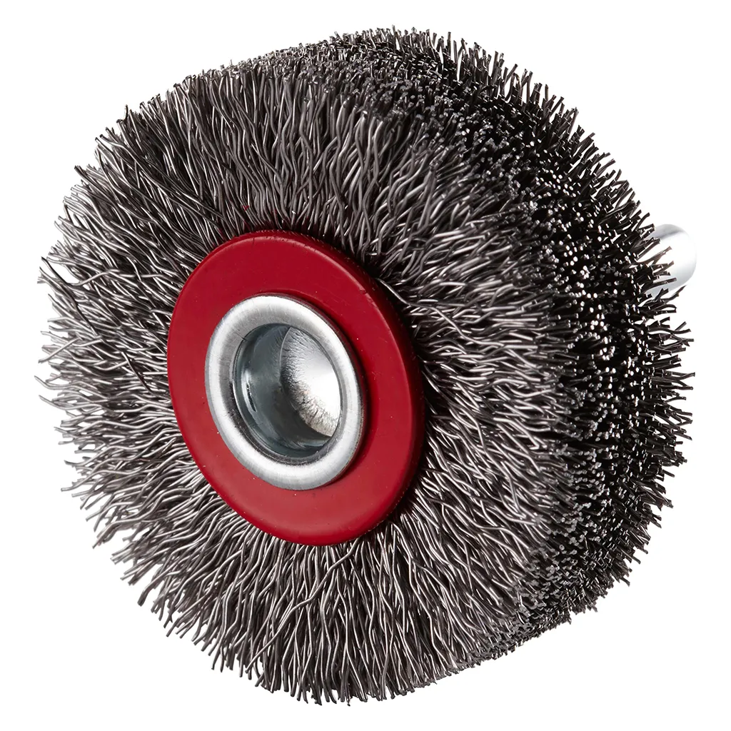 Brosse circulaire en acier avec fil d’acier ondulé sur tige 6 mm pour une utilisation sur meuleuses droites. Avec vitesse de rotation maximale admise élevée.
