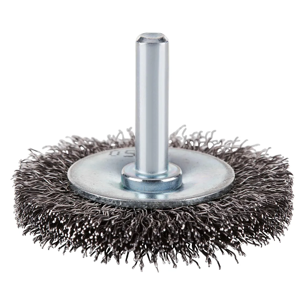 Brosse circulaire en acier avec fil d’acier ondulé sur tige 6 mm pour une utilisation sur perceuses.