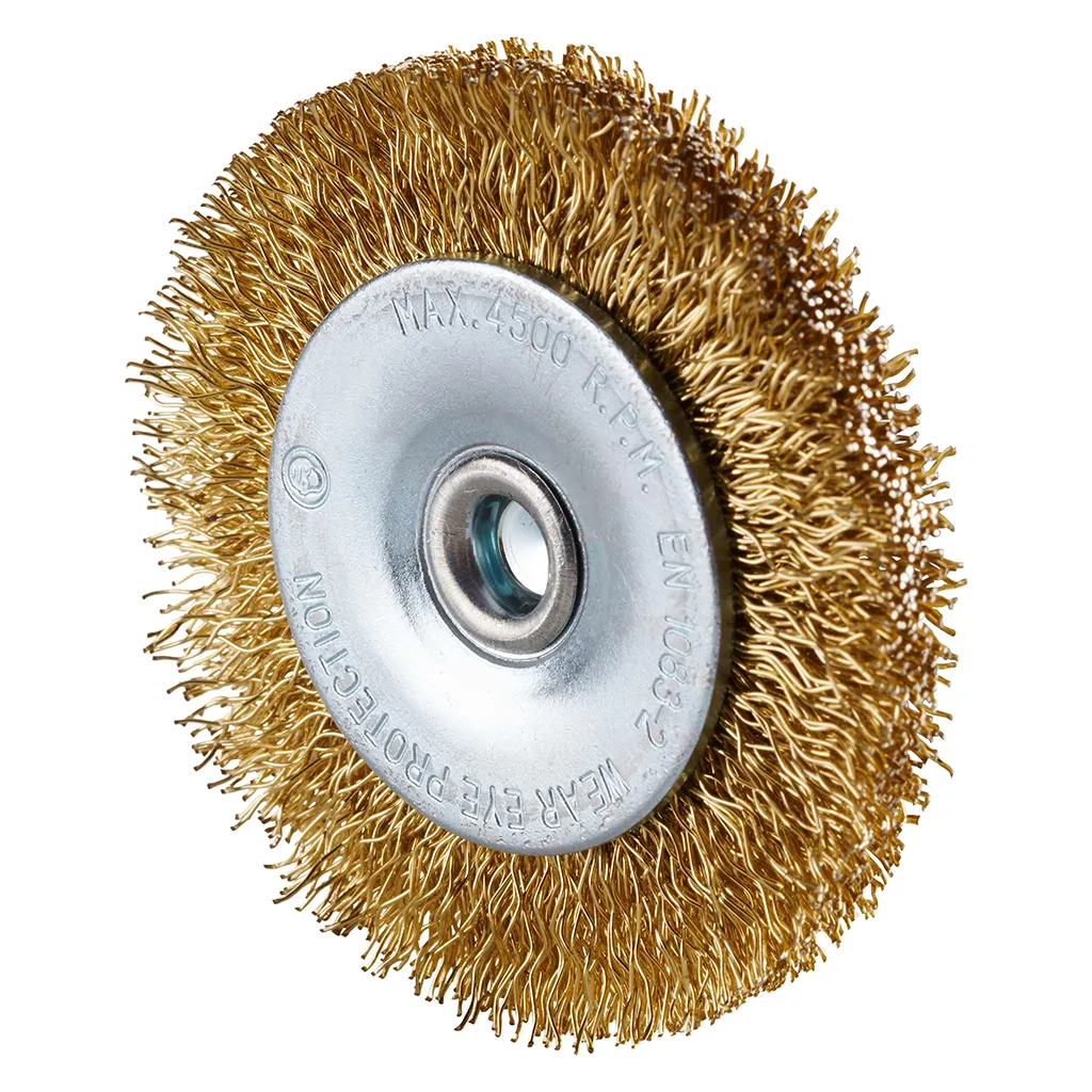 Brosse circulaire en acier avec fil d’acier ondulé sur tige 6 mm pour une utilisation sur perceuses.