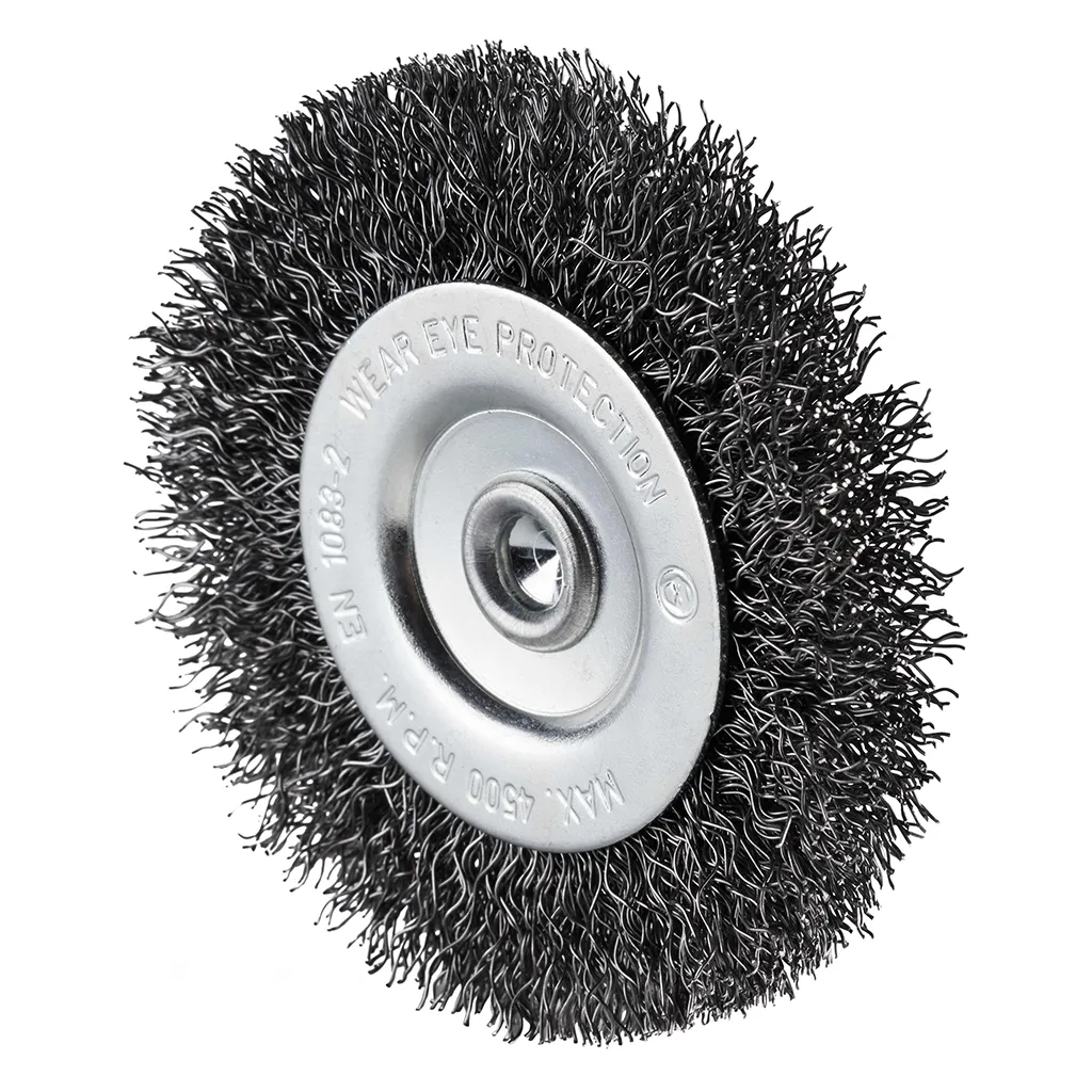 Brosse circulaire en acier avec fil d’acier ondulé sur tige 6 mm pour une utilisation sur perceuses.
