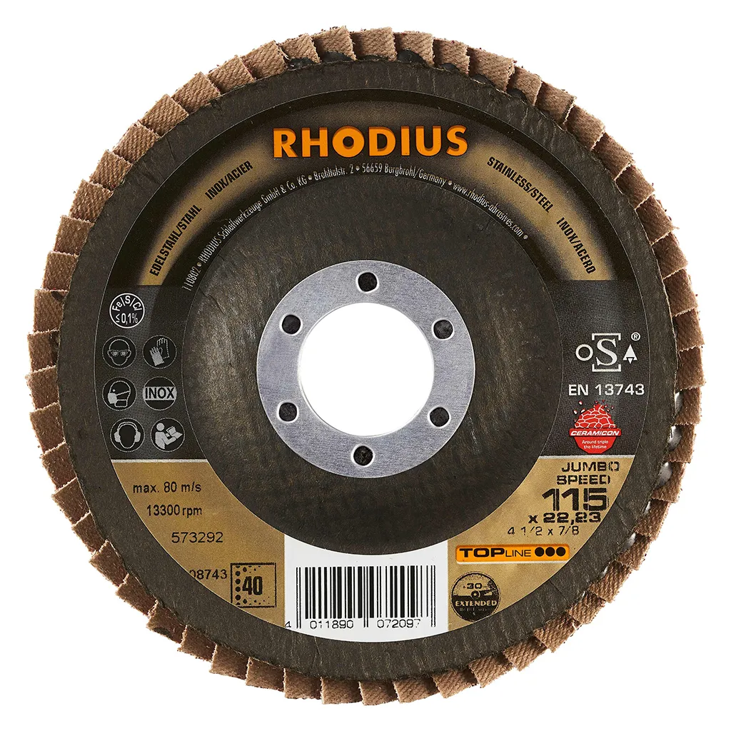 Ce disque a été conçu conformément à la norme EN 13743, satisfait aux exigences de sécurité et est homologué par l’oSA. Il est doté d’un plateau support en fibres de verre. Son utilisateur peut travailler en exerçant de fortes pressions sur sa machine. Le JUMBO SPEED EXTENDED utilise un grain céramique de qualité (corindon fritté) comme grain abrasif. Celui-ci est auto-affûtant. Tous les disques à lamelles RHODIUS ne contiennent en outre ni fer, ni soufre. Les lamelles sont placées de manière conique sur ce disque. Le positionnement conique des lamelles à 10° améliore l’ergonomie pendant le meulage et facilite ainsi la manipulation.