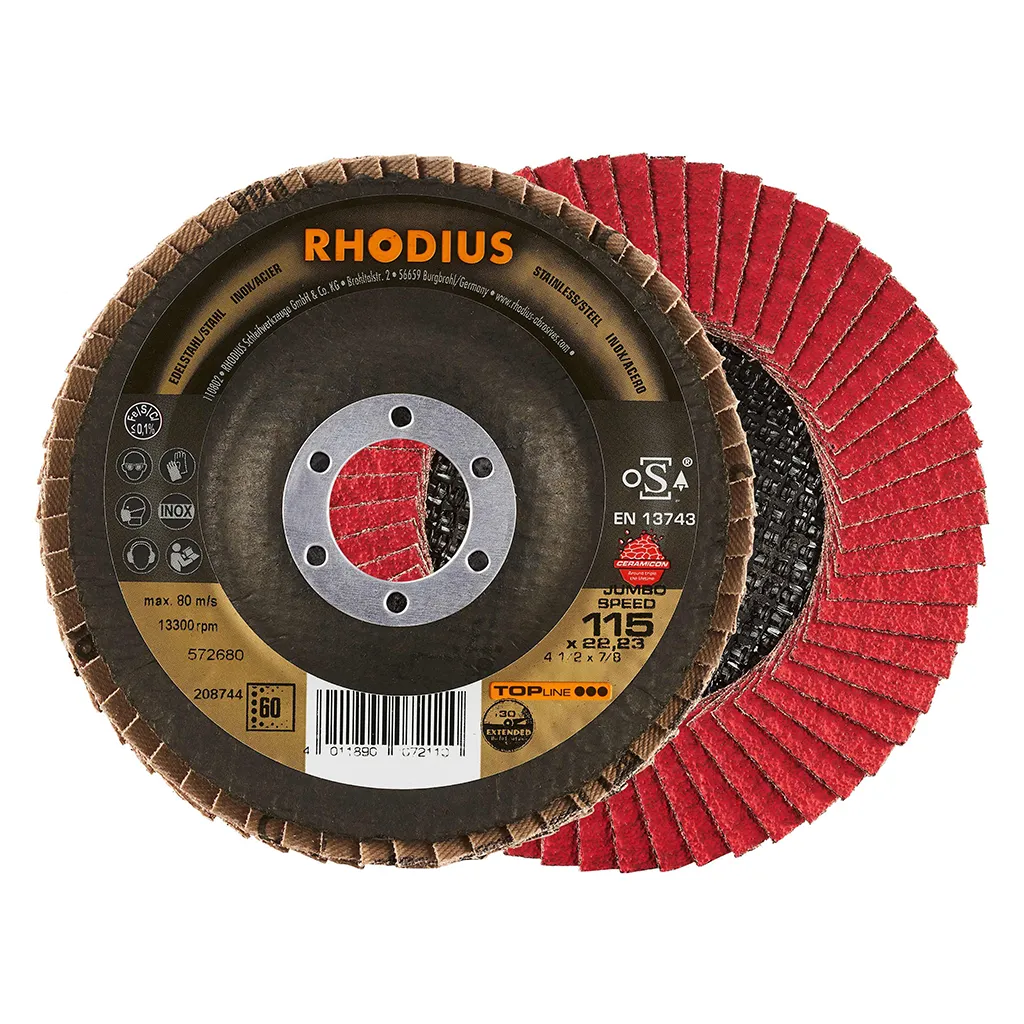 Ce disque a été conçu conformément à la norme EN 13743, satisfait aux exigences de sécurité et est homologué par l’oSA. Il est doté d’un plateau support en fibres de verre. Son utilisateur peut travailler en exerçant de fortes pressions sur sa machine. Le JUMBO SPEED EXTENDED utilise un grain céramique de qualité (corindon fritté) comme grain abrasif. Celui-ci est auto-affûtant. Tous les disques à lamelles RHODIUS ne contiennent en outre ni fer, ni soufre. Les lamelles sont placées de manière conique sur ce disque. Le positionnement conique des lamelles à 10° améliore l’ergonomie pendant le meulage et facilite ainsi la manipulation.