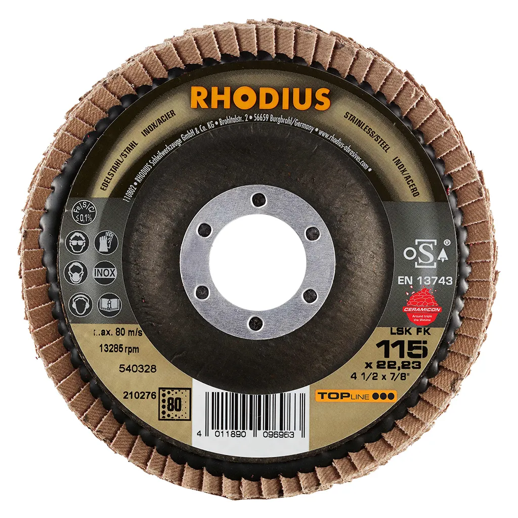 Ce disque a été conçu conformément à la norme EN 13743, satisfait aux exigences de sécurité et est homologué par l’oSA. Il est doté d’un plateau support en fibres de verre. Son utilisateur peut travailler en exerçant de fortes pressions sur sa machine. Le LSK FK utilise un grain céramique de qualité (corindon fritté) comme grain abrasif. Celui-ci est auto-affûtant. Tous les disques à lamelles RHODIUS ne contiennent en outre ni fer, ni soufre. Les lamelles sont placées de manière conique sur ce disque. Le positionnement conique des lamelles à 10° améliore l’ergonomie pendant le meulage et facilite ainsi la manipulation. Avec ses lamelles à débord plus longues, le LSK FK convient parfaitement pour le meulage des cordons de soudure.