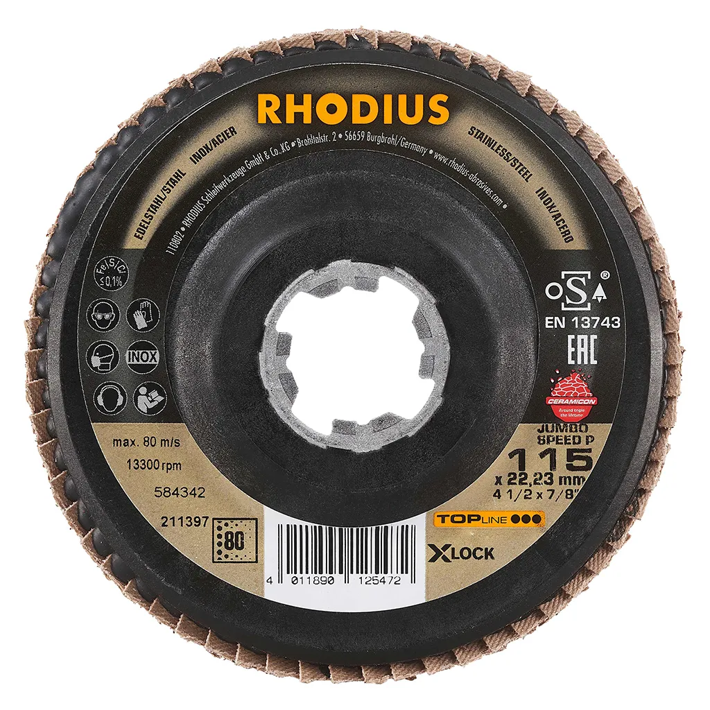 Ce disque a été conçu conformément à la norme EN 13743, satisfait aux exigences de sécurité et est homologué par l’oSA. Le plateau support est fabriqué en polyamide, permettant un meulage très délicat. Le JUMBO SPEED P X-LOCK utilise un grain céramique de qualité (corindon fritté) comme grain abrasif. Celui-ci est auto-affûtant. Tous les disques à lamelles RHODIUS ne contiennent en outre ni fer, ni soufre. Les lamelles sont placées de manière conique sur ce disque. Le positionnement conique des lamelles à 10° améliore l’ergonomie pendant le meulage et facilite ainsi la manipulation.