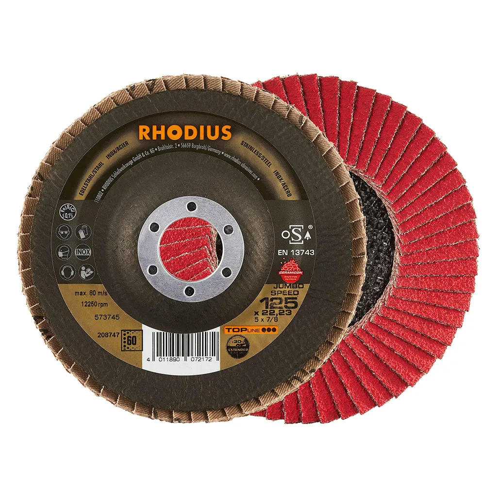 Ce disque a été conçu conformément à la norme EN 13743, satisfait aux exigences de sécurité et est homologué par l’oSA. Il est doté d’un plateau support en fibres de verre. Son utilisateur peut travailler en exerçant de fortes pressions sur sa machine. Le JUMBO SPEED EXTENDED utilise un grain céramique de qualité (corindon fritté) comme grain abrasif. Celui-ci est auto-affûtant. Tous les disques à lamelles RHODIUS ne contiennent en outre ni fer, ni soufre. Les lamelles sont placées de manière conique sur ce disque. Le positionnement conique des lamelles à 10° améliore l’ergonomie pendant le meulage et facilite ainsi la manipulation.