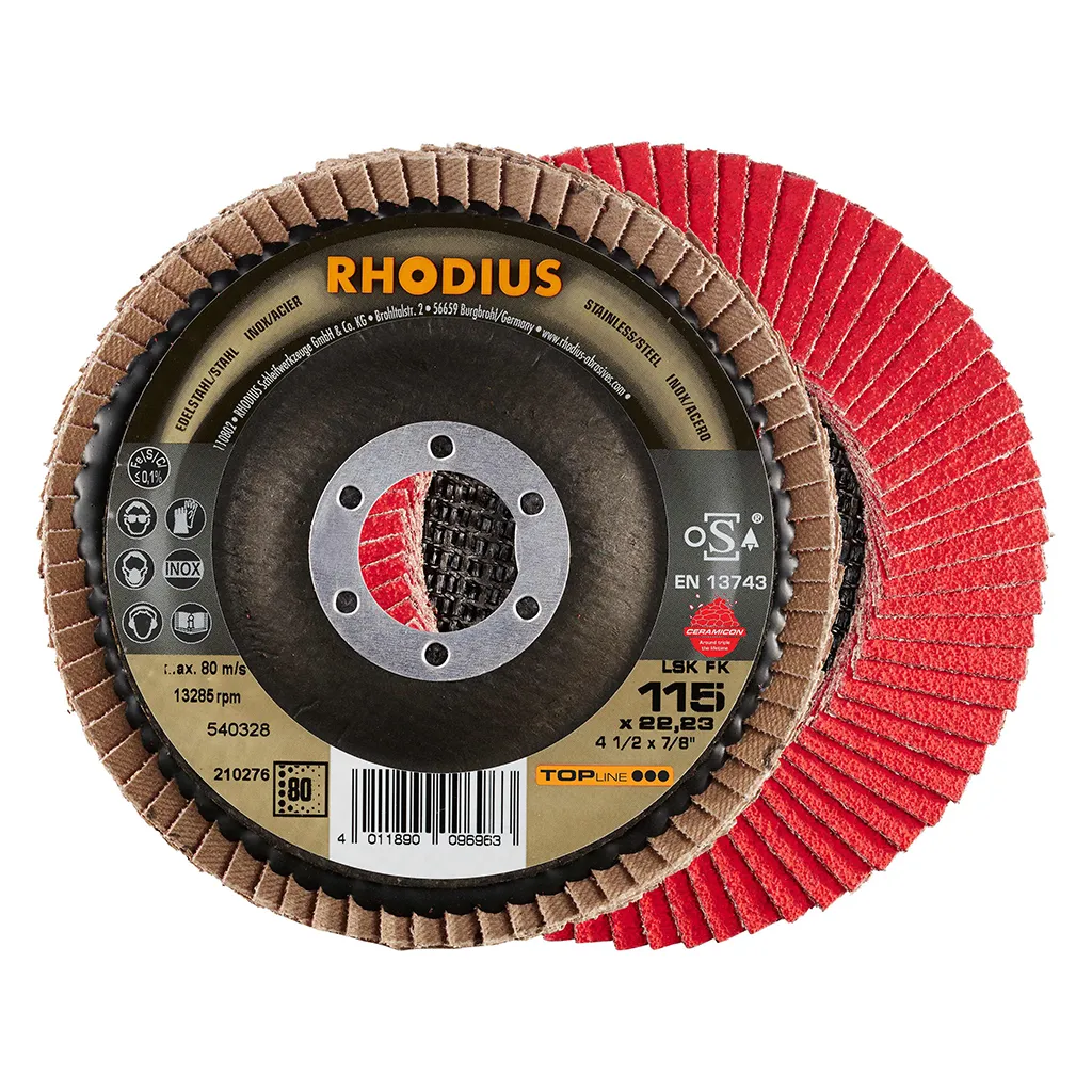 Ce disque a été conçu conformément à la norme EN 13743, satisfait aux exigences de sécurité et est homologué par l’oSA. Il est doté d’un plateau support en fibres de verre. Son utilisateur peut travailler en exerçant de fortes pressions sur sa machine. Le LSK FK utilise un grain céramique de qualité (corindon fritté) comme grain abrasif. Celui-ci est auto-affûtant. Tous les disques à lamelles RHODIUS ne contiennent en outre ni fer, ni soufre. Les lamelles sont placées de manière conique sur ce disque. Le positionnement conique des lamelles à 10° améliore l’ergonomie pendant le meulage et facilite ainsi la manipulation. Avec ses lamelles à débord plus longues, le LSK FK convient parfaitement pour le meulage des cordons de soudure.
