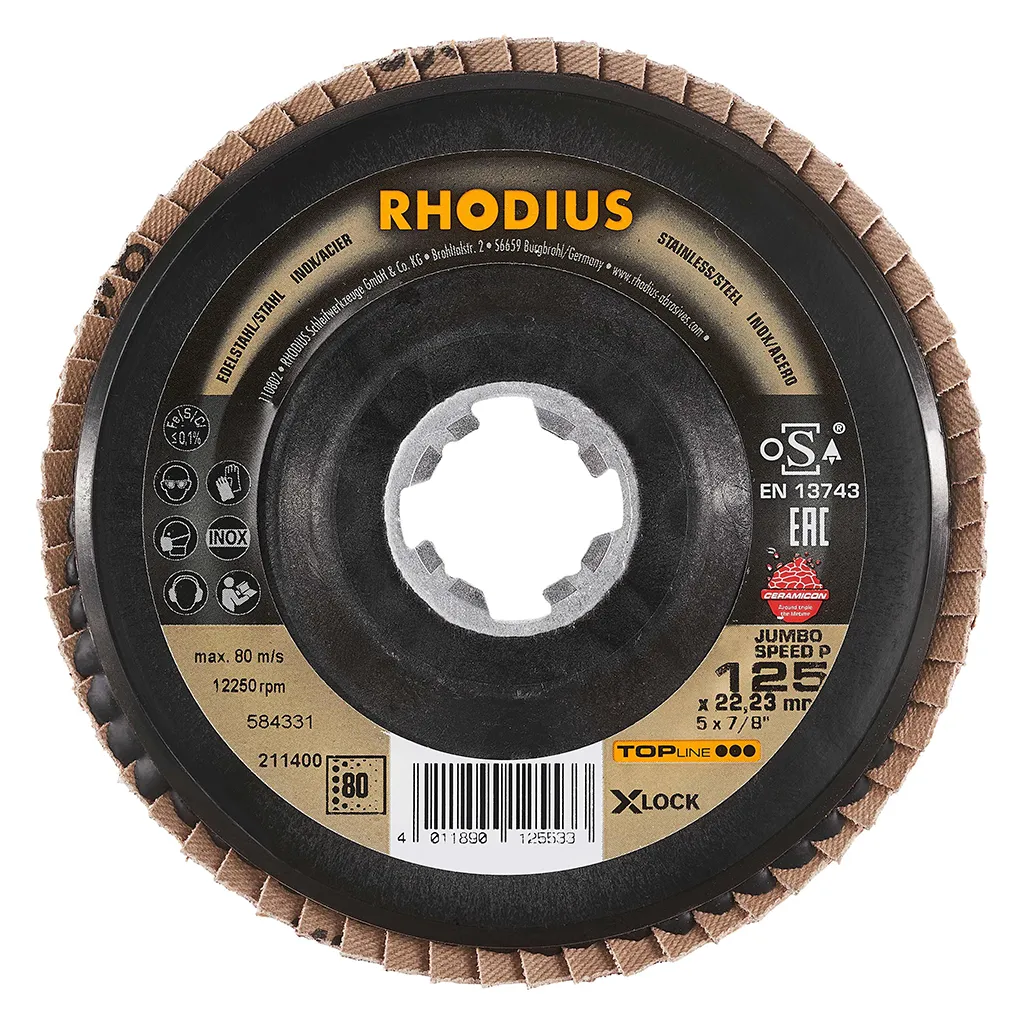 Ce disque a été conçu conformément à la norme EN 13743, satisfait aux exigences de sécurité et est homologué par l’oSA. Le plateau support est fabriqué en polyamide, permettant un meulage très délicat. Le JUMBO SPEED P X-LOCK utilise un grain céramique de qualité (corindon fritté) comme grain abrasif. Celui-ci est auto-affûtant. Tous les disques à lamelles RHODIUS ne contiennent en outre ni fer, ni soufre. Les lamelles sont placées de manière conique sur ce disque. Le positionnement conique des lamelles à 10° améliore l’ergonomie pendant le meulage et facilite ainsi la manipulation.