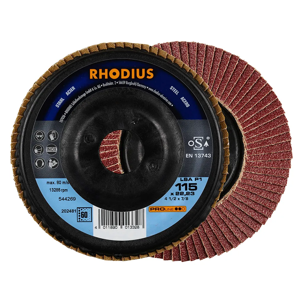Ce disque a été conçu de manière à satisfaire aux exigences de sécurité de la norme EN 13743 et est homologué par l’oSA. Le plateau support est fabriqué en polyamide, permettant un meulage très délicat. Le LSA P1 utilise de l’oxyde d’aluminium (corindon) de qualité comme grain abrasif. Celui-ci est auto-affûtant. Tous les disques à lamelles RHODIUS ne contiennent en outre ni fer, ni soufre. Les lamelles sont placées de manière conique sur ce disque. Le positionnement conique des lamelles à 10° améliore l’ergonomie pendant le meulage et facilite ainsi la manipulation.