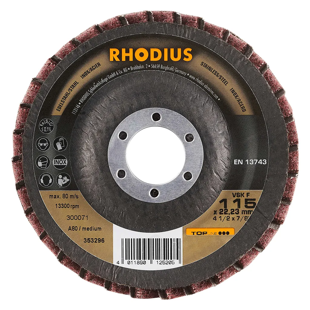 Ce disque a été conçu conformément à la norme EN 13743, satisfait aux exigences de sécurité et est homologué par l’oSA. Il est doté d’un plateau support en fibres de verre. Son utilisateur peut travailler en exerçant de fortes pressions sur sa machine. Le disque à lamelles VSK F se caractérise par sa combinaison d’une toile abrasive avec un disque non-tissé. Du zirconium de qualité est utilisé ici comme grain abrasif. Tous les disques à lamelles RHODIUS ne contiennent en outre ni fer, ni soufre. Les lamelles sont placées de manière conique sur ce disque. Le positionnement conique des lamelles à 10° améliore l’ergonomie pendant le meulage et facilite ainsi la manipulation.