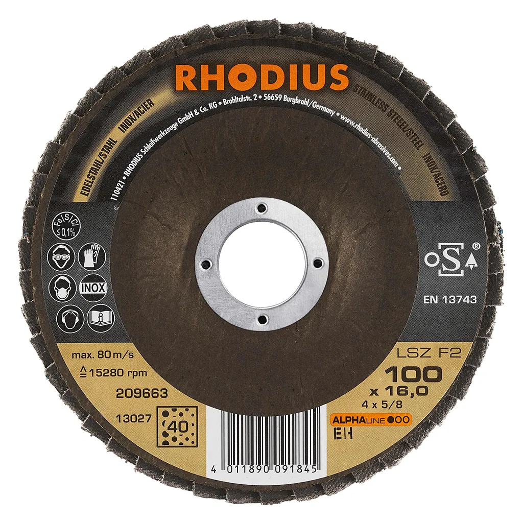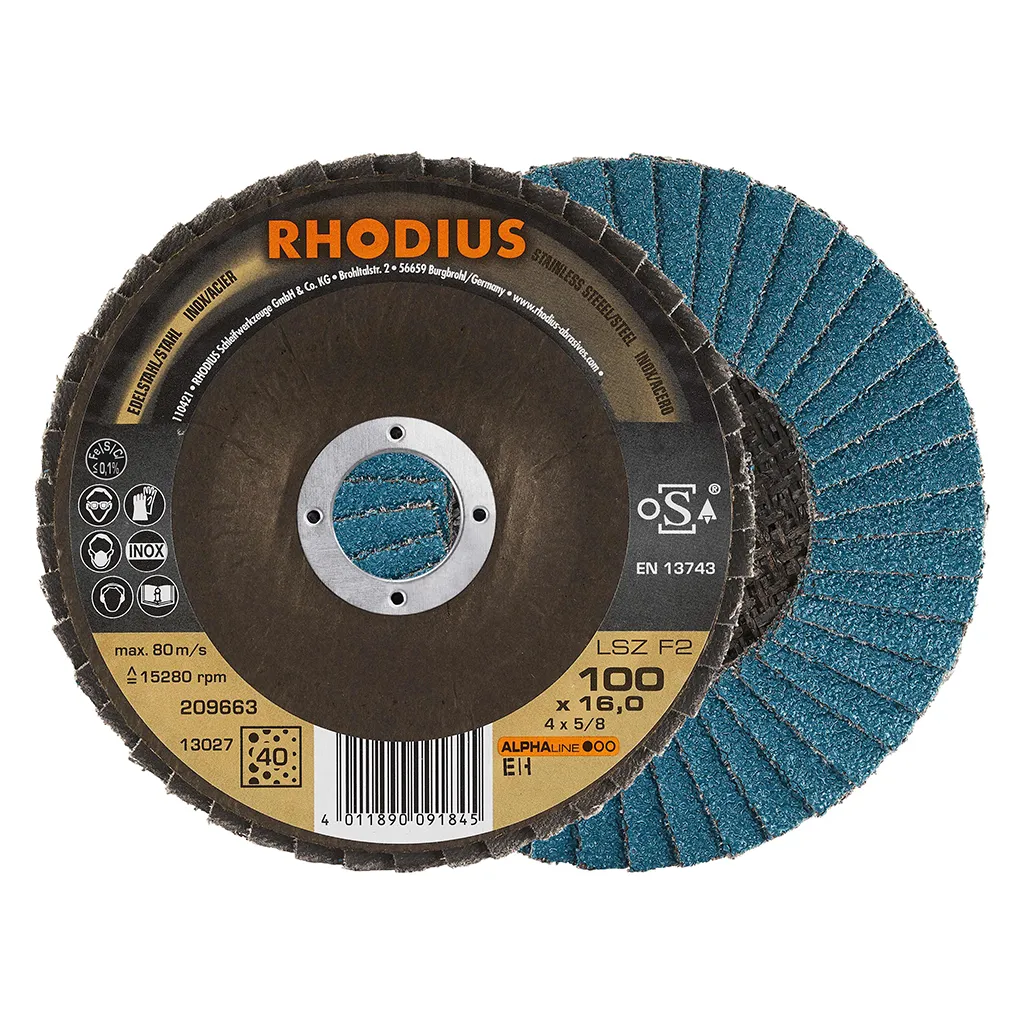 Ce disque a été conçu conformément à la norme EN 13743, satisfait aux exigences de sécurité et est homologué par l’oSA. Il est doté d’un plateau support en fibres de verre. Son utilisateur peut travailler en exerçant de fortes pressions sur sa machine. Le LSZ F2 utilise du zirconium de qualité comme grain abrasif. Tous les disques à lamelles RHODIUS ne contiennent en outre ni fer, ni soufre. Les lamelles sont placées de manière conique sur ce disque. Le positionnement conique des lamelles à 10° améliore l’ergonomie pendant le meulage et facilite ainsi la manipulation.