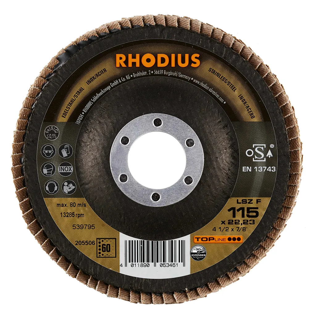 Ce disque a été conçu conformément à la norme EN 13743, satisfait aux exigences de sécurité et est homologué par l’oSA. Il est doté d’un plateau support en fibres de verre. Son utilisateur peut travailler en exerçant de fortes pressions sur sa machine. Le LSZ F EXTENDED utilise du zirconium de qualité comme grain abrasif. Celui-ci est auto-affûtant. Tous les disques à lamelles RHODIUS ne contiennent en outre ni fer, ni soufre. Les lamelles sont placées de manière conique sur ce disque. Le positionnement conique des lamelles à 10° améliore l’ergonomie pendant le meulage et facilite ainsi la manipulation.