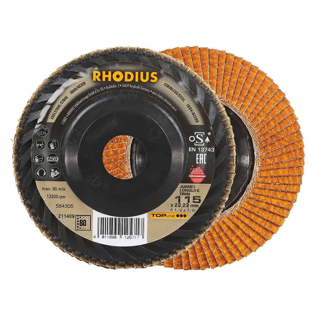 Ce disque a été conçu conformément à la norme EN 13743, satisfait aux exigences de sécurité et est homologué par l’oSA. Le plateau support spécial est fabriqué en ABS. Le JUMBO LONGLIFE TRIM utilise un grain céramique de qualité (corindon fritté) avec de l’oxyde d’aluminium (corindon) comme grain abrasif. Tous les disques à lamelles RHODIUS ne contiennent en outre ni fer, ni soufre. Les lamelles sont placées à plat sur ce disque.