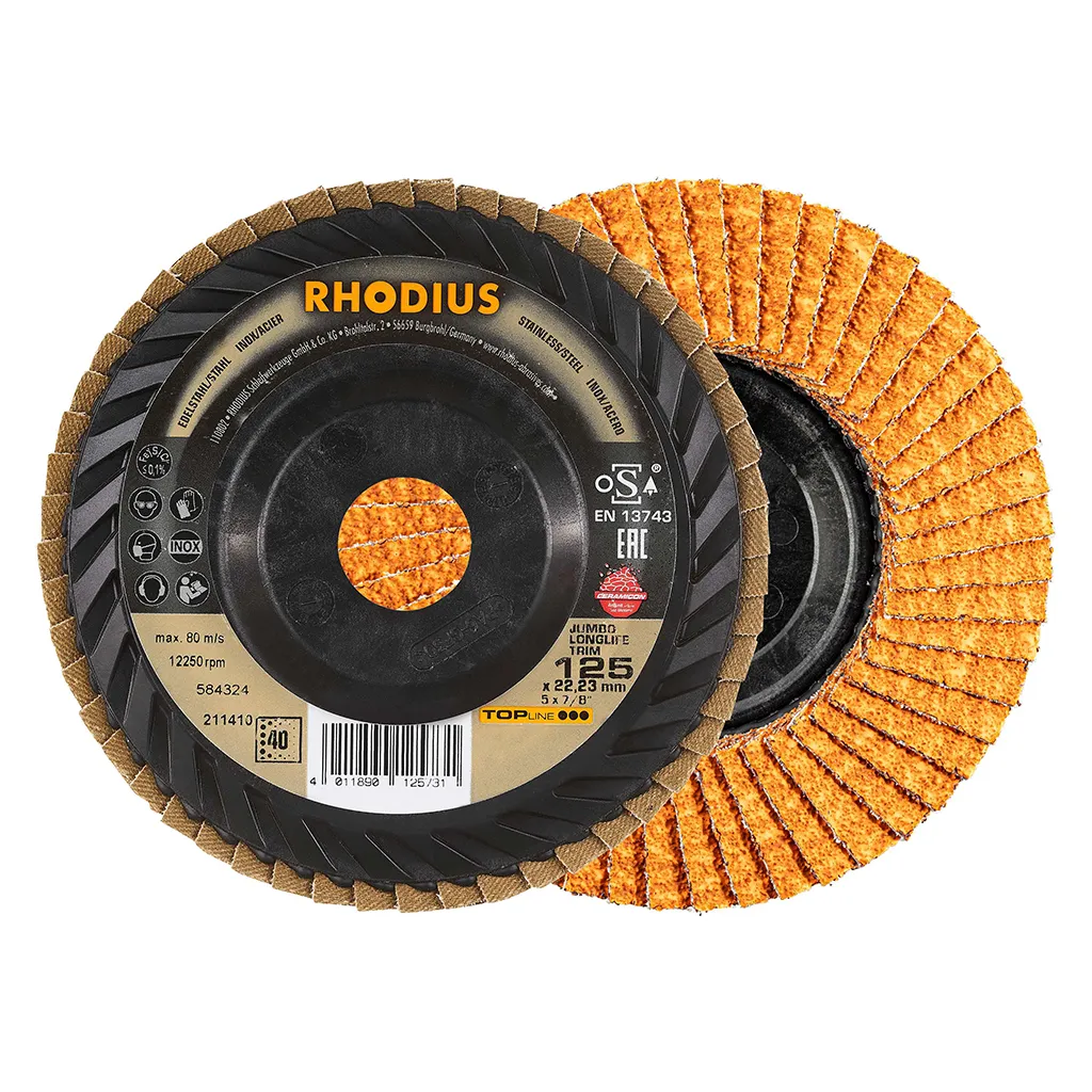 Ce disque a été conçu conformément à la norme EN 13743, satisfait aux exigences de sécurité et est homologué par l’oSA. Le plateau support spécial est fabriqué en ABS. Le JUMBO LONGLIFE TRIM utilise un grain céramique de qualité (corindon fritté) avec de l’oxyde d’aluminium (corindon) comme grain abrasif. Tous les disques à lamelles RHODIUS ne contiennent en outre ni fer, ni soufre. Les lamelles sont placées à plat sur ce disque.
