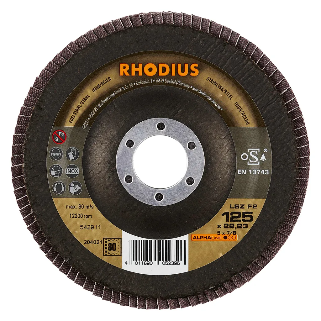 Ce disque a été conçu conformément à la norme EN 13743, satisfait aux exigences de sécurité et est homologué par l’oSA. Il est doté d’un plateau support en fibres de verre. Son utilisateur peut travailler en exerçant de fortes pressions sur sa machine. Le LSZ F2 utilise du zirconium de qualité comme grain abrasif. Tous les disques à lamelles RHODIUS ne contiennent en outre ni fer, ni soufre. Les lamelles sont placées de manière conique sur ce disque. Le positionnement conique des lamelles à 10° améliore l’ergonomie pendant le meulage et facilite ainsi la manipulation.