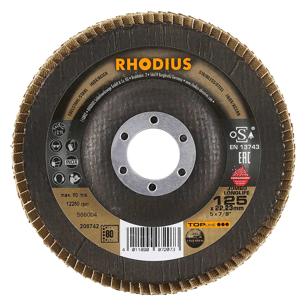 Ce disque a été conçu conformément à la norme EN 13743, satisfait aux exigences de sécurité et est homologué par l’oSA. Il est doté d’un plateau support en fibres de verre. Son utilisateur peut travailler en exerçant de fortes pressions sur sa machine. Le JUMBO LONGLIFE EXTENDED utilise un grain céramique de qualité (corindon fritté) avec du zirconium comme grain abrasif. Tous les disques à lamelles RHODIUS ne contiennent en outre ni fer, ni soufre. Les lamelles sont placées de manière conique sur ce disque. Le positionnement conique des lamelles à 10° améliore l’ergonomie pendant le meulage et facilite ainsi la manipulation.