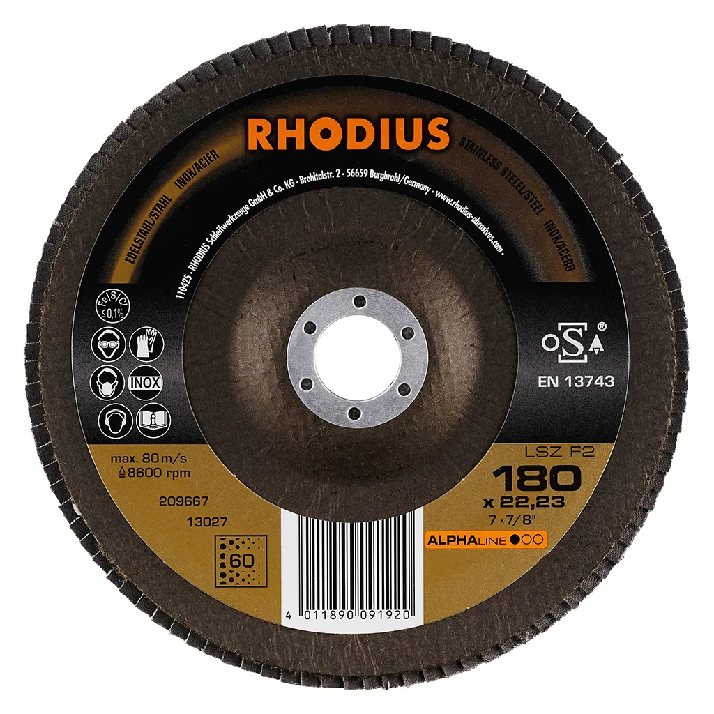 Ce disque a été conçu conformément à la norme EN 13743, satisfait aux exigences de sécurité et est homologué par l’oSA. Il est doté d’un plateau support en fibres de verre. Son utilisateur peut travailler en exerçant de fortes pressions sur sa machine. Le LSZ F2 utilise du zirconium de qualité comme grain abrasif. Tous les disques à lamelles RHODIUS ne contiennent en outre ni fer, ni soufre. Les lamelles sont placées de manière conique sur ce disque. Le positionnement conique des lamelles à 10° améliore l’ergonomie pendant le meulage et facilite ainsi la manipulation.