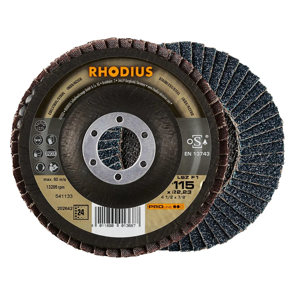Ce disque a été conçu conformément à la norme EN 13743, satisfait aux exigences de sécurité et est homologué par l’oSA. Il est doté d’un plateau support en fibres de verre. Son utilisateur peut travailler en exerçant de fortes pressions sur sa machine. Le LSZ F1 utilise du zirconium de qualité comme grain abrasif. Tous les disques à lamelles RHODIUS ne contiennent en outre ni fer, ni soufre. Les lamelles sont placées de manière conique sur ce disque. Le positionnement conique des lamelles à 10° améliore l’ergonomie pendant le meulage et facilite ainsi la manipulation.