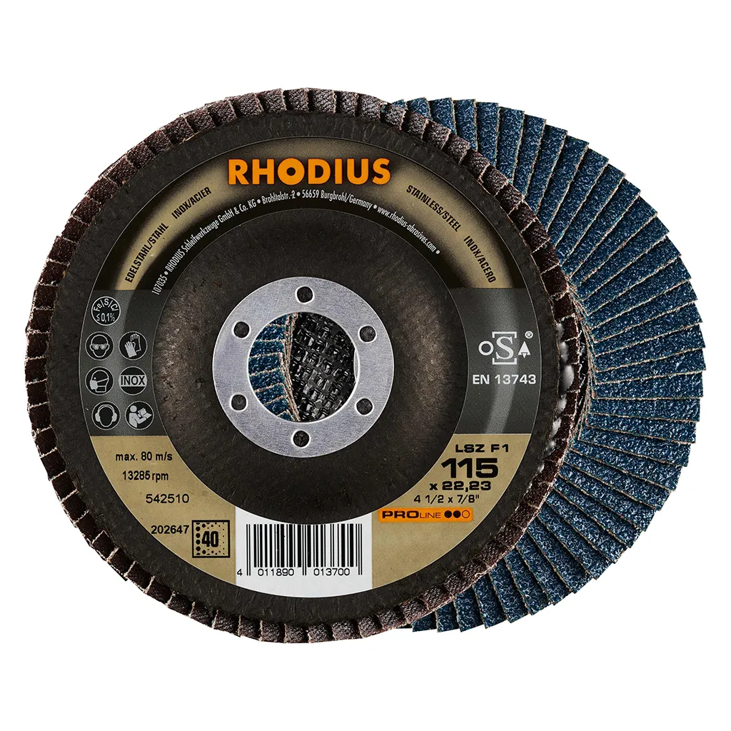 Ce disque a été conçu conformément à la norme EN 13743, satisfait aux exigences de sécurité et est homologué par l’oSA. Il est doté d’un plateau support en fibres de verre. Son utilisateur peut travailler en exerçant de fortes pressions sur sa machine. Le LSZ F1 utilise du zirconium de qualité comme grain abrasif. Tous les disques à lamelles RHODIUS ne contiennent en outre ni fer, ni soufre. Les lamelles sont placées de manière conique sur ce disque. Le positionnement conique des lamelles à 10° améliore l’ergonomie pendant le meulage et facilite ainsi la manipulation.