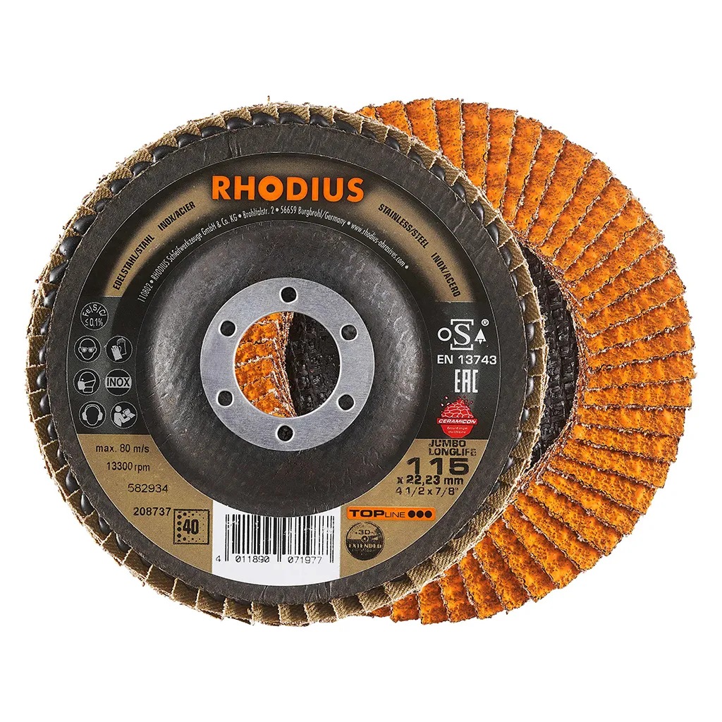 Ce disque a été conçu conformément à la norme EN 13743, satisfait aux exigences de sécurité et est homologué par l’oSA. Il est doté d’un plateau support en fibres de verre. Son utilisateur peut travailler en exerçant de fortes pressions sur sa machine. Le JUMBO LONGLIFE EXTENDED utilise un grain céramique de qualité (corindon fritté) avec du zirconium comme grain abrasif. Tous les disques à lamelles RHODIUS ne contiennent en outre ni fer, ni soufre. Les lamelles sont placées de manière conique sur ce disque. Le positionnement conique des lamelles à 10° améliore l’ergonomie pendant le meulage et facilite ainsi la manipulation.