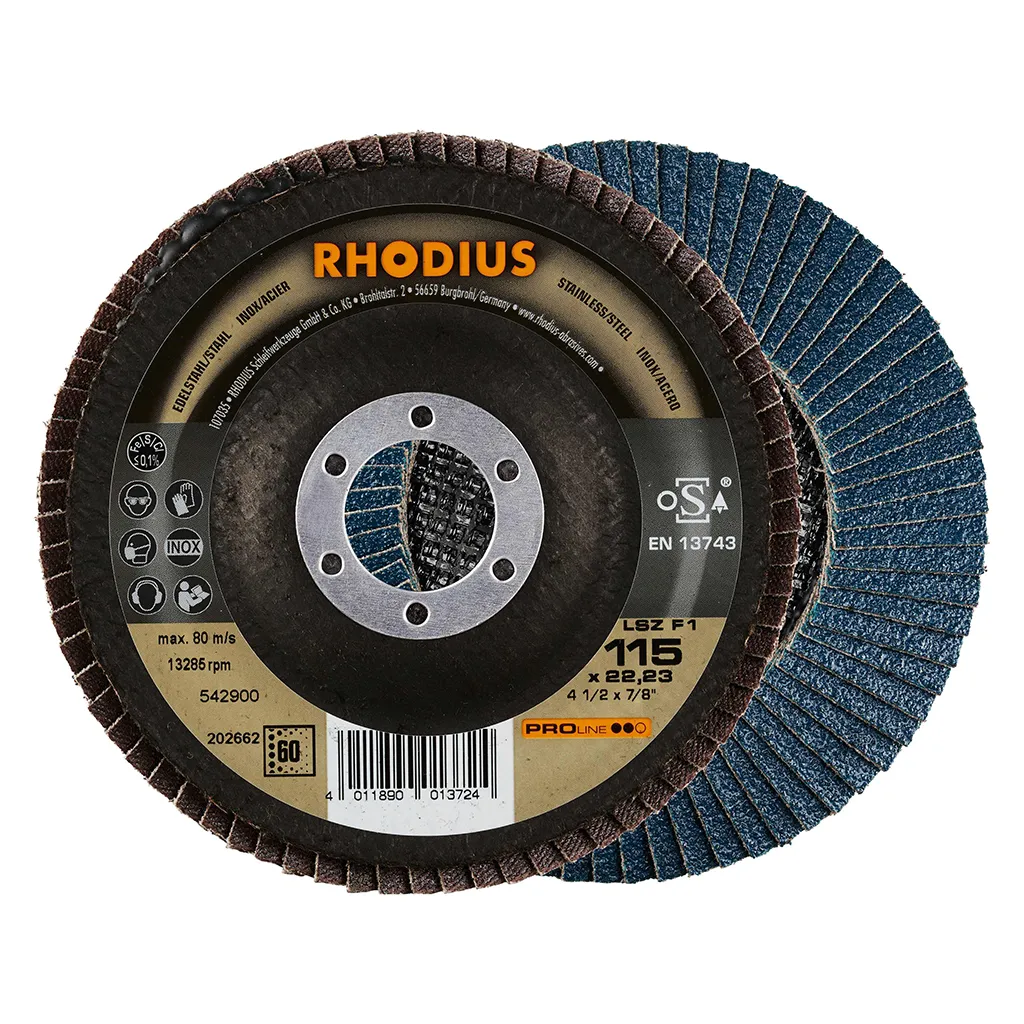 Ce disque a été conçu conformément à la norme EN 13743, satisfait aux exigences de sécurité et est homologué par l’oSA. Il est doté d’un plateau support en fibres de verre. Son utilisateur peut travailler en exerçant de fortes pressions sur sa machine. Le LSZ F1 utilise du zirconium de qualité comme grain abrasif. Tous les disques à lamelles RHODIUS ne contiennent en outre ni fer, ni soufre. Les lamelles sont placées de manière conique sur ce disque. Le positionnement conique des lamelles à 10° améliore l’ergonomie pendant le meulage et facilite ainsi la manipulation.
