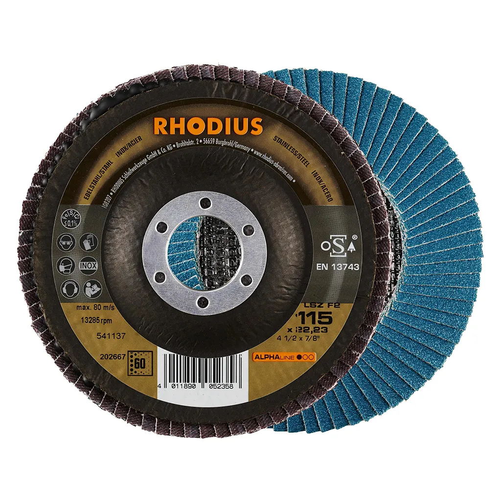 Ce disque a été conçu conformément à la norme EN 13743, satisfait aux exigences de sécurité et est homologué par l’oSA. Il est doté d’un plateau support en fibres de verre. Son utilisateur peut travailler en exerçant de fortes pressions sur sa machine. Le LSZ F2 utilise du zirconium de qualité comme grain abrasif. Tous les disques à lamelles RHODIUS ne contiennent en outre ni fer, ni soufre. Les lamelles sont placées de manière conique sur ce disque. Le positionnement conique des lamelles à 10° améliore l’ergonomie pendant le meulage et facilite ainsi la manipulation.