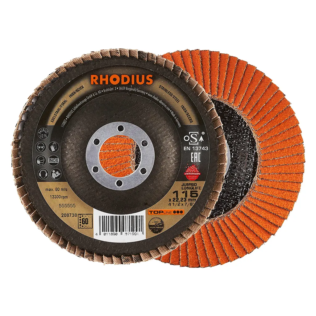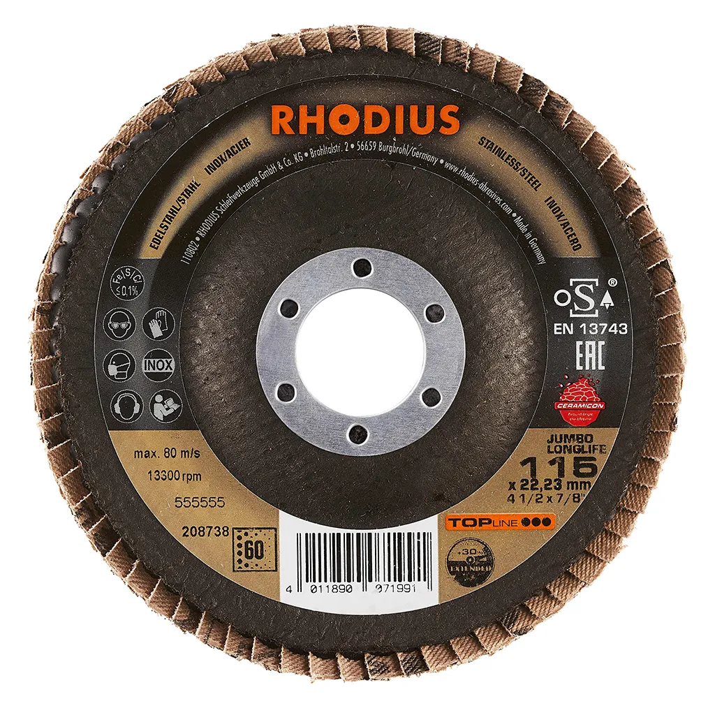 Ce disque a été conçu conformément à la norme EN 13743, satisfait aux exigences de sécurité et est homologué par l’oSA. Il est doté d’un plateau support en fibres de verre. Son utilisateur peut travailler en exerçant de fortes pressions sur sa machine. Le JUMBO LONGLIFE EXTENDED utilise un grain céramique de qualité (corindon fritté) avec du zirconium comme grain abrasif. Tous les disques à lamelles RHODIUS ne contiennent en outre ni fer, ni soufre. Les lamelles sont placées de manière conique sur ce disque. Le positionnement conique des lamelles à 10° améliore l’ergonomie pendant le meulage et facilite ainsi la manipulation.