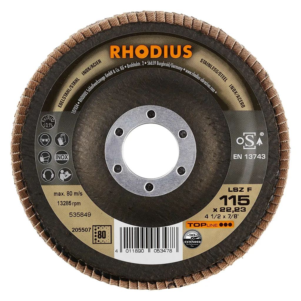 Ce disque a été conçu conformément à la norme EN 13743, satisfait aux exigences de sécurité et est homologué par l’oSA. Il est doté d’un plateau support en fibres de verre. Son utilisateur peut travailler en exerçant de fortes pressions sur sa machine. Le LSZ F EXTENDED utilise du zirconium de qualité comme grain abrasif. Celui-ci est auto-affûtant. Tous les disques à lamelles RHODIUS ne contiennent en outre ni fer, ni soufre. Les lamelles sont placées de manière conique sur ce disque. Le positionnement conique des lamelles à 10° améliore l’ergonomie pendant le meulage et facilite ainsi la manipulation.