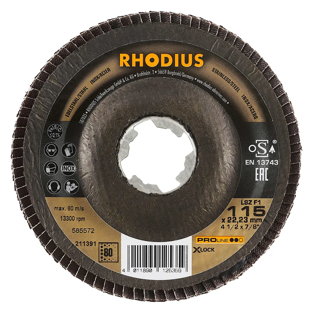Ce disque a été conçu conformément à la norme EN 13743, satisfait aux exigences de sécurité et est homologué par l’oSA. Le plateau support est fabriqué en tissu en fibres de verre. Son utilisateur peut travailler en exerçant de fortes pressions sur sa machine. Le LSZ F1 X-LOCK utilise du zirconium de qualité comme grain abrasif. Tous les disques à lamelles RHODIUS ne contiennent en outre ni fer, ni soufre. Les lamelles sont placées de manière conique sur ce disque. Le positionnement conique des lamelles à 10° améliore l’ergonomie pendant le meulage et facilite ainsi la manipulation.