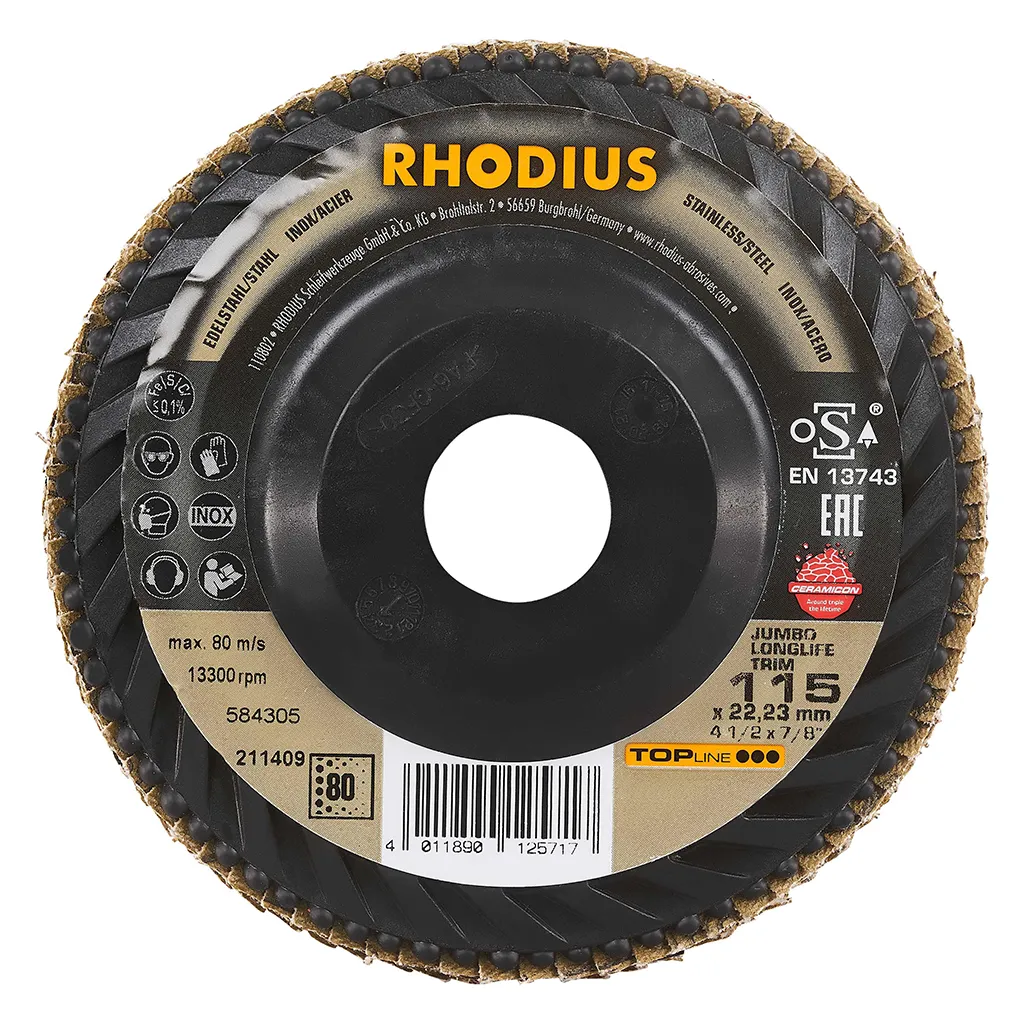 Ce disque a été conçu conformément à la norme EN 13743, satisfait aux exigences de sécurité et est homologué par l’oSA. Le plateau support spécial est fabriqué en ABS. Le JUMBO LONGLIFE TRIM utilise un grain céramique de qualité (corindon fritté) avec de l’oxyde d’aluminium (corindon) comme grain abrasif. Tous les disques à lamelles RHODIUS ne contiennent en outre ni fer, ni soufre. Les lamelles sont placées à plat sur ce disque.