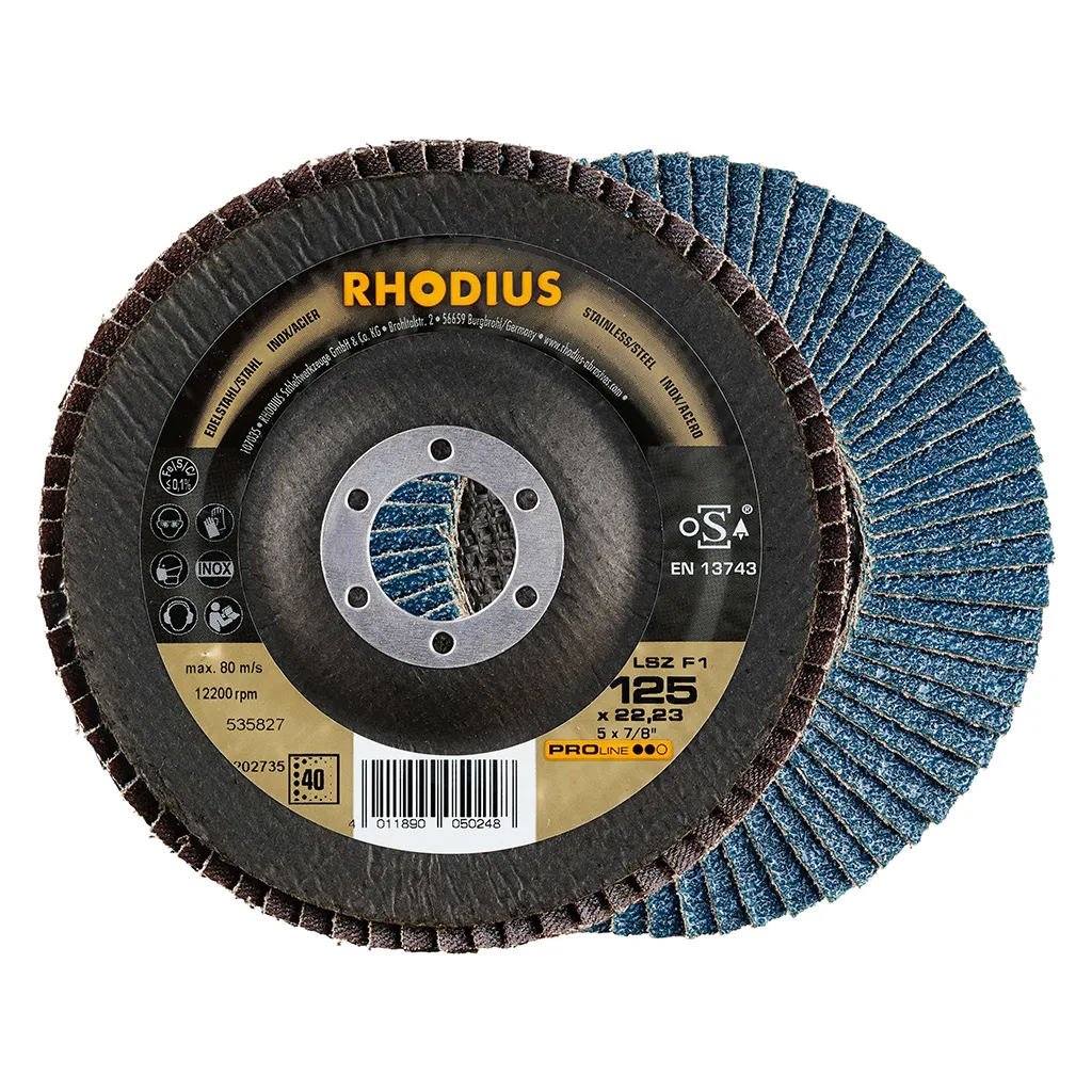 Ce disque a été conçu conformément à la norme EN 13743, satisfait aux exigences de sécurité et est homologué par l’oSA. Il est doté d’un plateau support en fibres de verre. Son utilisateur peut travailler en exerçant de fortes pressions sur sa machine. Le LSZ F1 utilise du zirconium de qualité comme grain abrasif. Tous les disques à lamelles RHODIUS ne contiennent en outre ni fer, ni soufre. Les lamelles sont placées de manière conique sur ce disque. Le positionnement conique des lamelles à 10° améliore l’ergonomie pendant le meulage et facilite ainsi la manipulation.