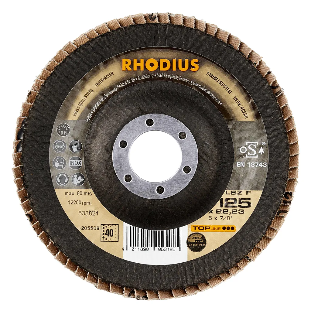 Ce disque a été conçu conformément à la norme EN 13743, satisfait aux exigences de sécurité et est homologué par l’oSA. Il est doté d’un plateau support en fibres de verre. Son utilisateur peut travailler en exerçant de fortes pressions sur sa machine. Le LSZ F EXTENDED utilise du zirconium de qualité comme grain abrasif. Celui-ci est auto-affûtant. Tous les disques à lamelles RHODIUS ne contiennent en outre ni fer, ni soufre. Les lamelles sont placées de manière conique sur ce disque. Le positionnement conique des lamelles à 10° améliore l’ergonomie pendant le meulage et facilite ainsi la manipulation.