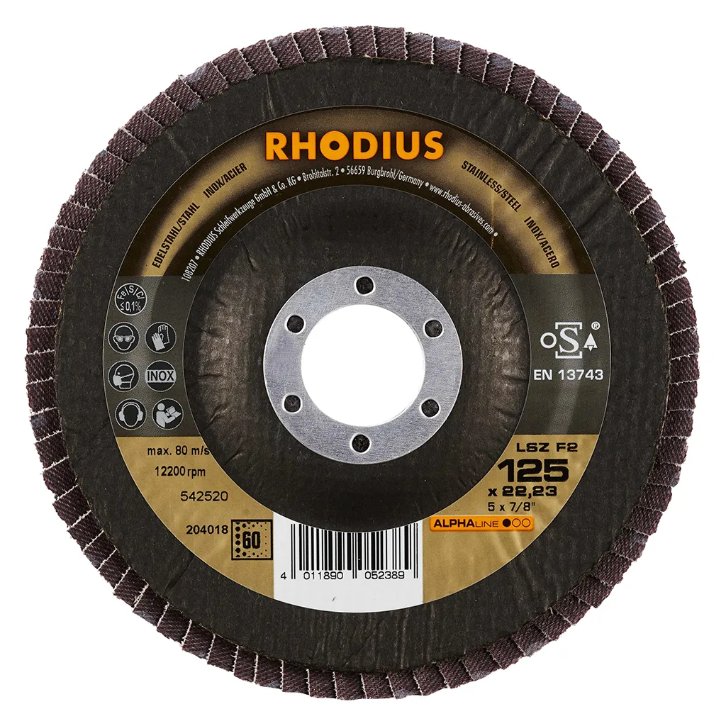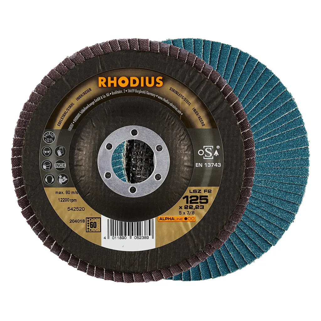 Ce disque a été conçu conformément à la norme EN 13743, satisfait aux exigences de sécurité et est homologué par l’oSA. Il est doté d’un plateau support en fibres de verre. Son utilisateur peut travailler en exerçant de fortes pressions sur sa machine. Le LSZ F2 utilise du zirconium de qualité comme grain abrasif. Tous les disques à lamelles RHODIUS ne contiennent en outre ni fer, ni soufre. Les lamelles sont placées de manière conique sur ce disque. Le positionnement conique des lamelles à 10° améliore l’ergonomie pendant le meulage et facilite ainsi la manipulation.