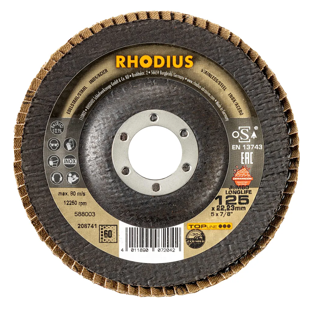 Ce disque a été conçu conformément à la norme EN 13743, satisfait aux exigences de sécurité et est homologué par l’oSA. Il est doté d’un plateau support en fibres de verre. Son utilisateur peut travailler en exerçant de fortes pressions sur sa machine. Le JUMBO LONGLIFE EXTENDED utilise un grain céramique de qualité (corindon fritté) avec du zirconium comme grain abrasif. Tous les disques à lamelles RHODIUS ne contiennent en outre ni fer, ni soufre. Les lamelles sont placées de manière conique sur ce disque. Le positionnement conique des lamelles à 10° améliore l’ergonomie pendant le meulage et facilite ainsi la manipulation.