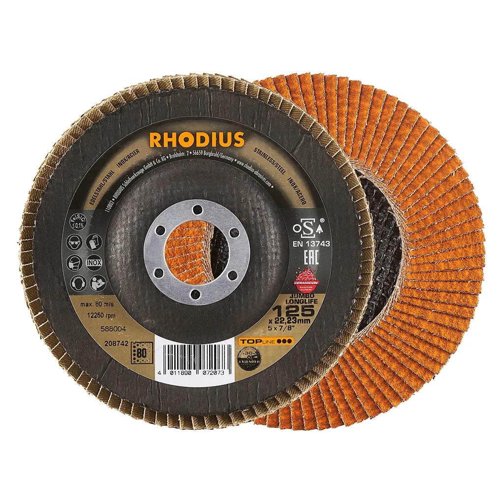Ce disque a été conçu conformément à la norme EN 13743, satisfait aux exigences de sécurité et est homologué par l’oSA. Il est doté d’un plateau support en fibres de verre. Son utilisateur peut travailler en exerçant de fortes pressions sur sa machine. Le JUMBO LONGLIFE EXTENDED utilise un grain céramique de qualité (corindon fritté) avec du zirconium comme grain abrasif. Tous les disques à lamelles RHODIUS ne contiennent en outre ni fer, ni soufre. Les lamelles sont placées de manière conique sur ce disque. Le positionnement conique des lamelles à 10° améliore l’ergonomie pendant le meulage et facilite ainsi la manipulation.