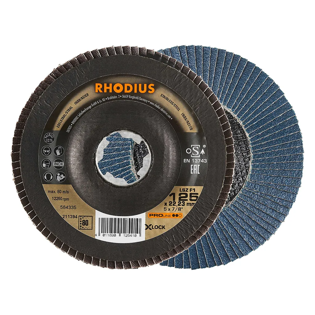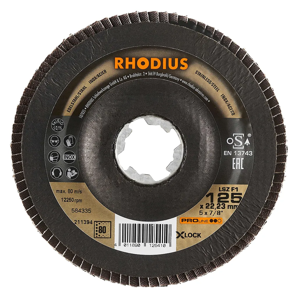 Ce disque a été conçu conformément à la norme EN 13743, satisfait aux exigences de sécurité et est homologué par l’oSA. Le plateau support est fabriqué en tissu en fibres de verre. Son utilisateur peut travailler en exerçant de fortes pressions sur sa machine. Le LSZ F1 X-LOCK utilise du zirconium de qualité comme grain abrasif. Tous les disques à lamelles RHODIUS ne contiennent en outre ni fer, ni soufre. Les lamelles sont placées de manière conique sur ce disque. Le positionnement conique des lamelles à 10° améliore l’ergonomie pendant le meulage et facilite ainsi la manipulation.