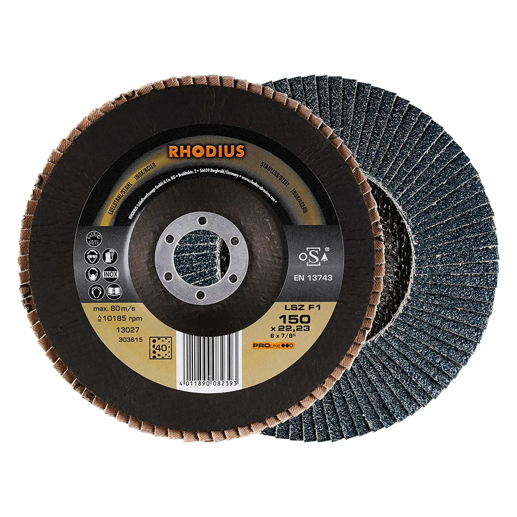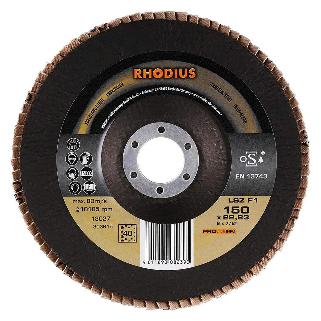 Ce disque a été conçu conformément à la norme EN 13743, satisfait aux exigences de sécurité et est homologué par l’oSA. Il est doté d’un plateau support en fibres de verre. Son utilisateur peut travailler en exerçant de fortes pressions sur sa machine. Le LSZ F1 utilise du zirconium de qualité comme grain abrasif. Tous les disques à lamelles RHODIUS ne contiennent en outre ni fer, ni soufre. Les lamelles sont placées de manière conique sur ce disque. Le positionnement conique des lamelles à 10° améliore l’ergonomie pendant le meulage et facilite ainsi la manipulation.