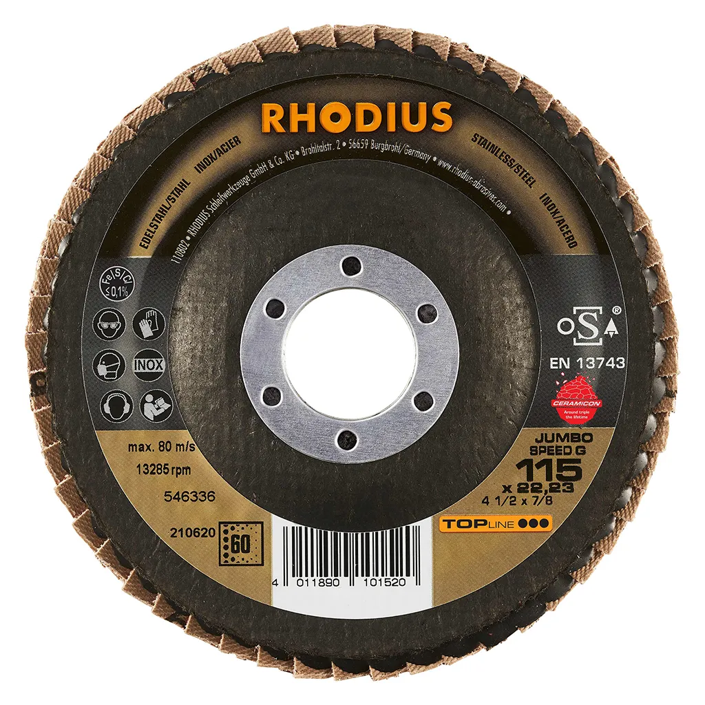 Ce disque a été conçu conformément à la norme EN 13743, satisfait aux exigences de sécurité et est homologué par l’oSA. Il est doté d’un plateau support en fibres de verre. Son utilisateur peut travailler en exerçant de fortes pressions sur sa machine. Le JUMBO SPEED G utilise un grain céramique de qualité (corindon fritté) comme grain abrasif. Celui-ci est auto-affûtant. Tous les disques à lamelles RHODIUS ne contiennent en outre ni fer, ni soufre. Les lamelles de ce disque sont plates. Lorsqu’un meulage plan est requis, l’agencement plat des lamelles facilite tout particulièrement le travail.