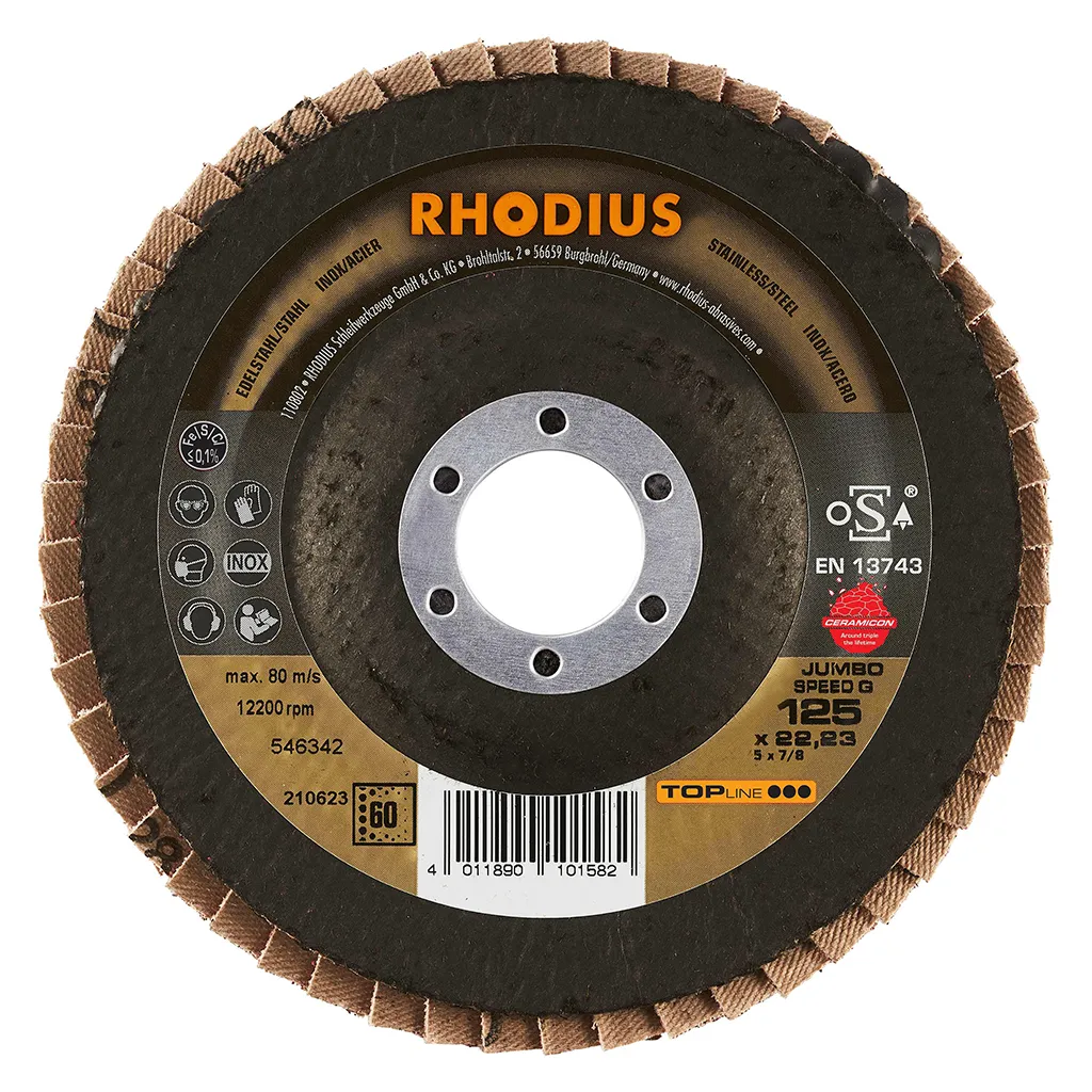 Ce disque a été conçu conformément à la norme EN 13743, satisfait aux exigences de sécurité et est homologué par l’oSA. Il est doté d’un plateau support en fibres de verre. Son utilisateur peut travailler en exerçant de fortes pressions sur sa machine. Le JUMBO SPEED G utilise un grain céramique de qualité (corindon fritté) comme grain abrasif. Celui-ci est auto-affûtant. Tous les disques à lamelles RHODIUS ne contiennent en outre ni fer, ni soufre. Les lamelles de ce disque sont plates. Lorsqu’un meulage plan est requis, l’agencement plat des lamelles facilite tout particulièrement le travail.