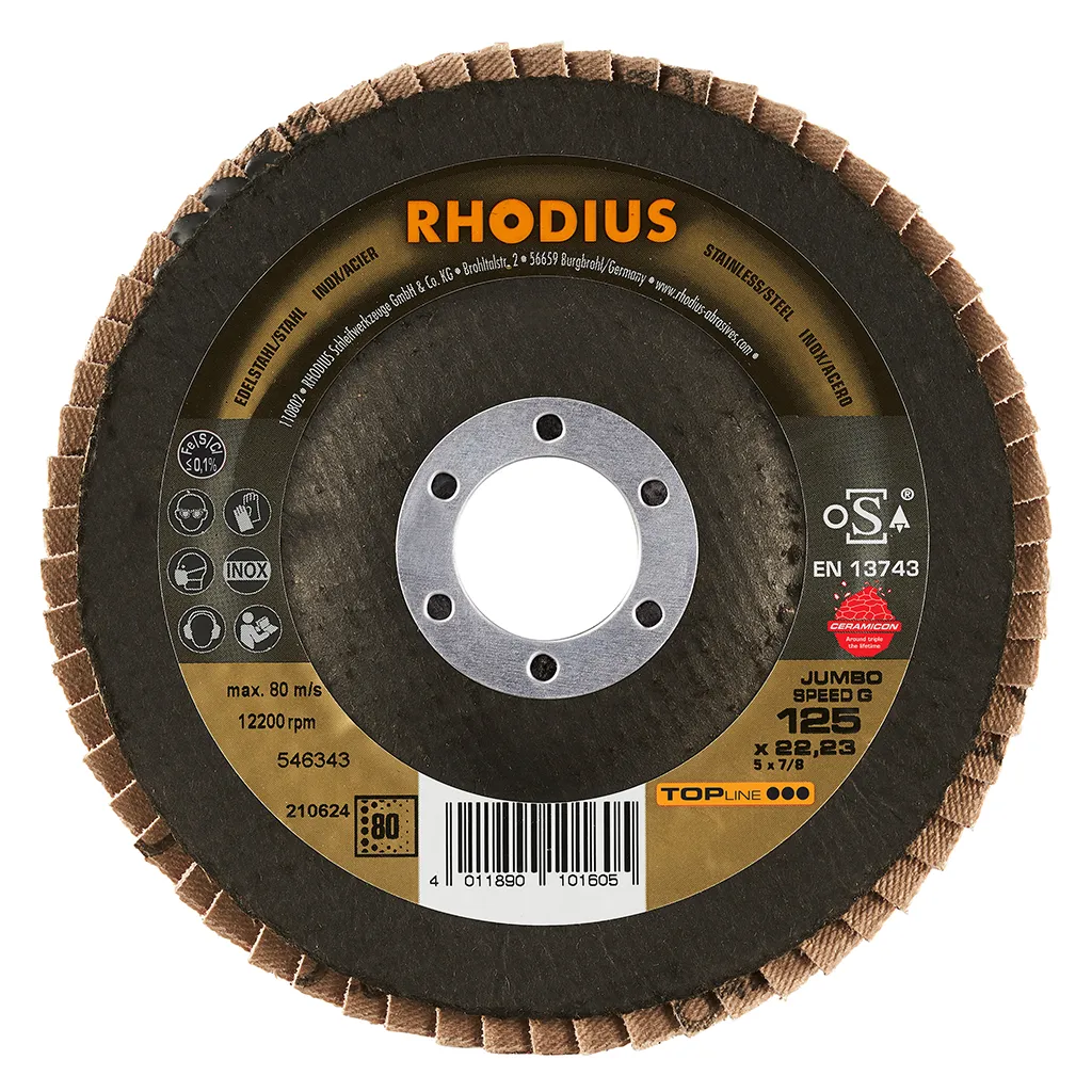 Ce disque a été conçu conformément à la norme EN 13743, satisfait aux exigences de sécurité et est homologué par l’oSA. Il est doté d’un plateau support en fibres de verre. Son utilisateur peut travailler en exerçant de fortes pressions sur sa machine. Le JUMBO SPEED G utilise un grain céramique de qualité (corindon fritté) comme grain abrasif. Celui-ci est auto-affûtant. Tous les disques à lamelles RHODIUS ne contiennent en outre ni fer, ni soufre. Les lamelles de ce disque sont plates. Lorsqu’un meulage plan est requis, l’agencement plat des lamelles facilite tout particulièrement le travail.