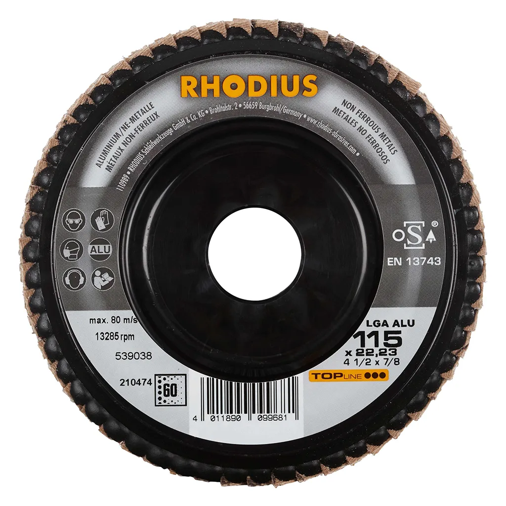 Ce disque a été conçu conformément à la norme EN 13743, satisfait aux exigences de sécurité et est homologué par l’oSA. Le plateau support spécial est fabriqué en ABS. Ce disque peut sans aucun problème être ajusté. En d’autres termes, les lamelles à débord s’usant au fil du temps peuvent être meulées, permettant de continuer à utiliser pleinement la surface de meulage encore intacte. Le LGA ALU utilise de l’oxyde d’aluminium (corindon) de qualité comme grain abrasif. Celui-ci est auto-affûtant. Tous les disques à lamelles RHODIUS ne contiennent en outre ni fer, ni soufre. Les lamelles de ce disque sont plates. Lorsqu’un meulage plan est requis, cet agencement plat des lamelles facilite tout particulièrement le travail.