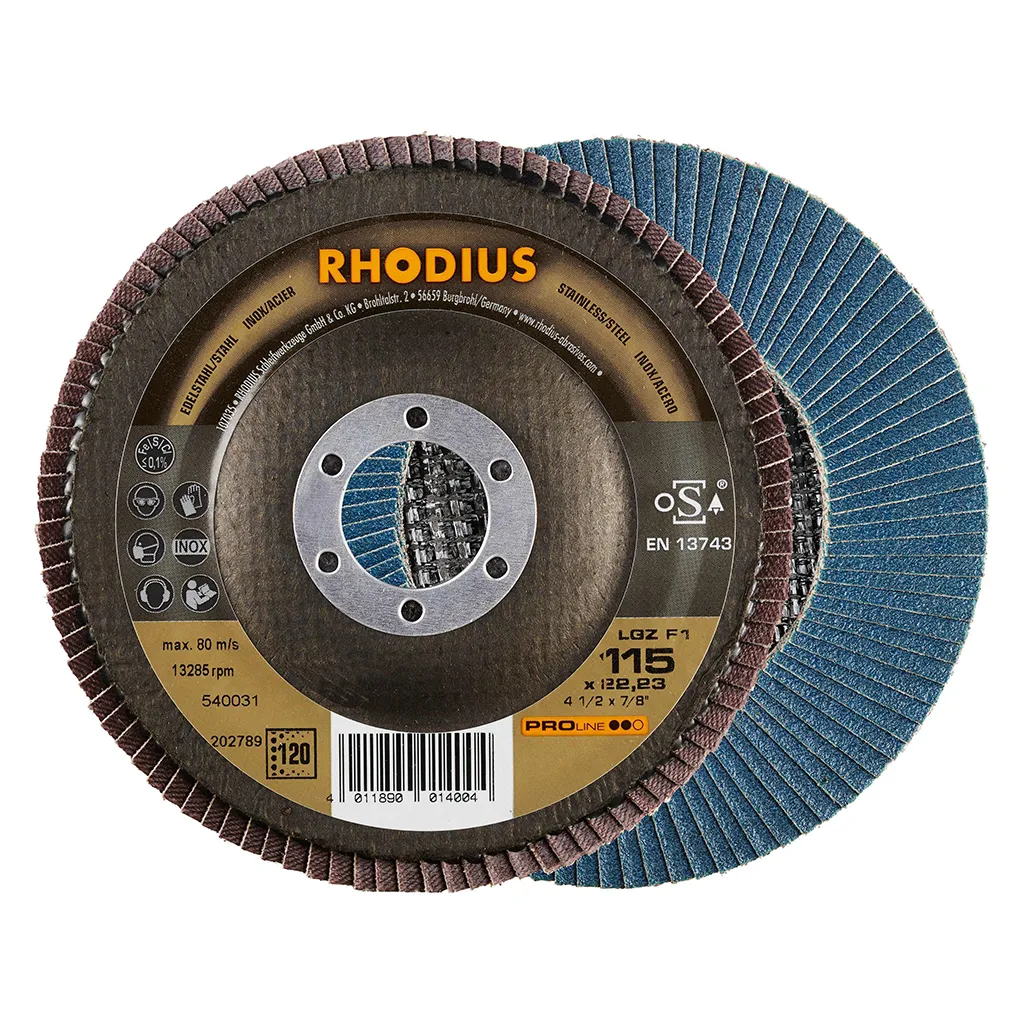 Ce disque a été conçu conformément à la norme EN 13743, satisfait aux exigences de sécurité et est homologué par l’oSA. Il est doté d’un plateau support en fibres de verre. Son utilisateur peut travailler en exerçant de fortes pressions sur sa machine. Le LGZ F1 utilise du zirconium de qualité comme grain abrasif. Tous les disques à lamelles RHODIUS ne contiennent en outre ni fer, ni soufre. Les lamelles de ce disque sont plates. Lorsqu’un meulage plan est requis, cet agencement plat des lamelles facilite tout particulièrement le travail.